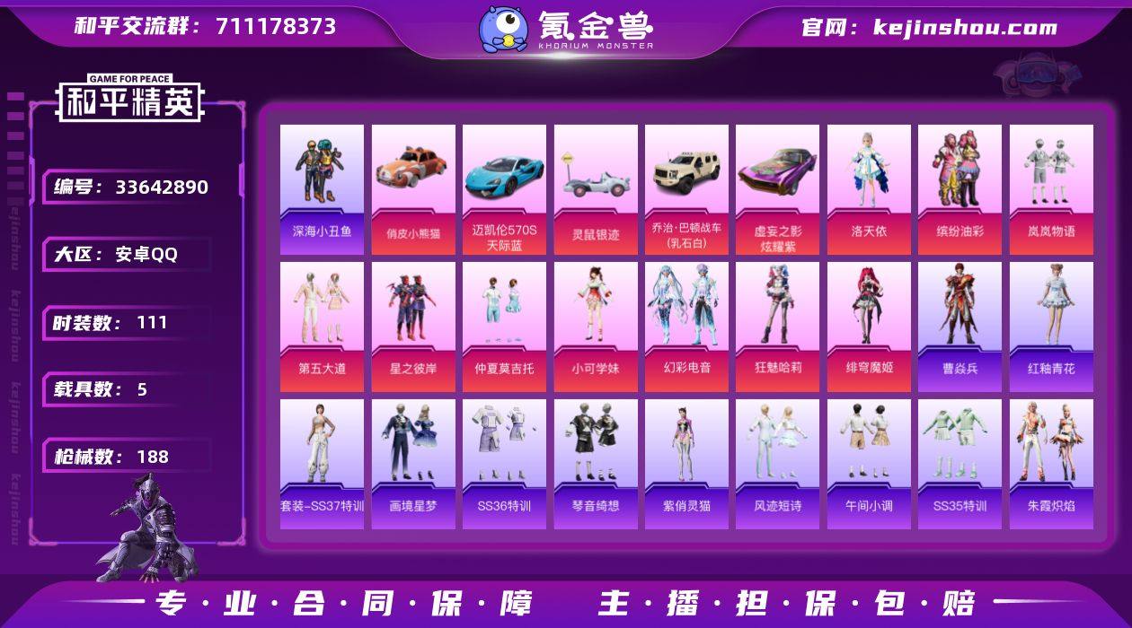【和平精英】11粉装,15特效枪,5载具,历史最高段位:绝世王牌12星 王牌印记8次 热力值:96178,179套装,295枪械,368装备,143战备;套装:套装-梦幻火箭,套装-缤纷油彩,角色-洛天依,套装-星之彼岸,套装-岚岚物语,角色-小可学妹,套装-第五大道,套装-仲夏莫吉托,角色-绯穹魔姬,角色-狂魅哈莉,套装-幻彩电音,套装-黄色运动,套装-蓝色运动,套装-黑色伏地魔,套装-骑行爱好者,套装-冰川格斗者,套装-竞技名士,套装-长空猛禽,套装-竞技勇士朋克,套装-蓝色守护者,套装-海岛探路者,套装-雨林探路者,套装-沙漠探路者,套装-旭日情侣,套装-特殊使命,套装-黄色格斗者,套装-灰色格斗者,套装-龙腾端午,套装-冰冻风暴,套装-幻影武者,套装-蓝彩潮人,套装-酷萌兔限定,套装-魅力单车,套装-绮丽涂鸦,套装-坚韧舞者,套装-竞技达人朋克,套装-朋克治安官,套装-夜莺强袭者,套装-都市漫游者,套装-野性战魂,套装-沙漠兵团,套装-丛林猎人,套装-雪山精英,套装-酷潮明星,套装-传奇侦探,套装-幻世战舞者,套装-弄潮海豚,套装-深海小丑鱼,套装-极速红龙,套装-海上生明月,套装-小丑鱼,套装-SS4特训,套装-破蛋小黄鸡,套装-疯狂小兔子,套装-舞夜骑士,套...