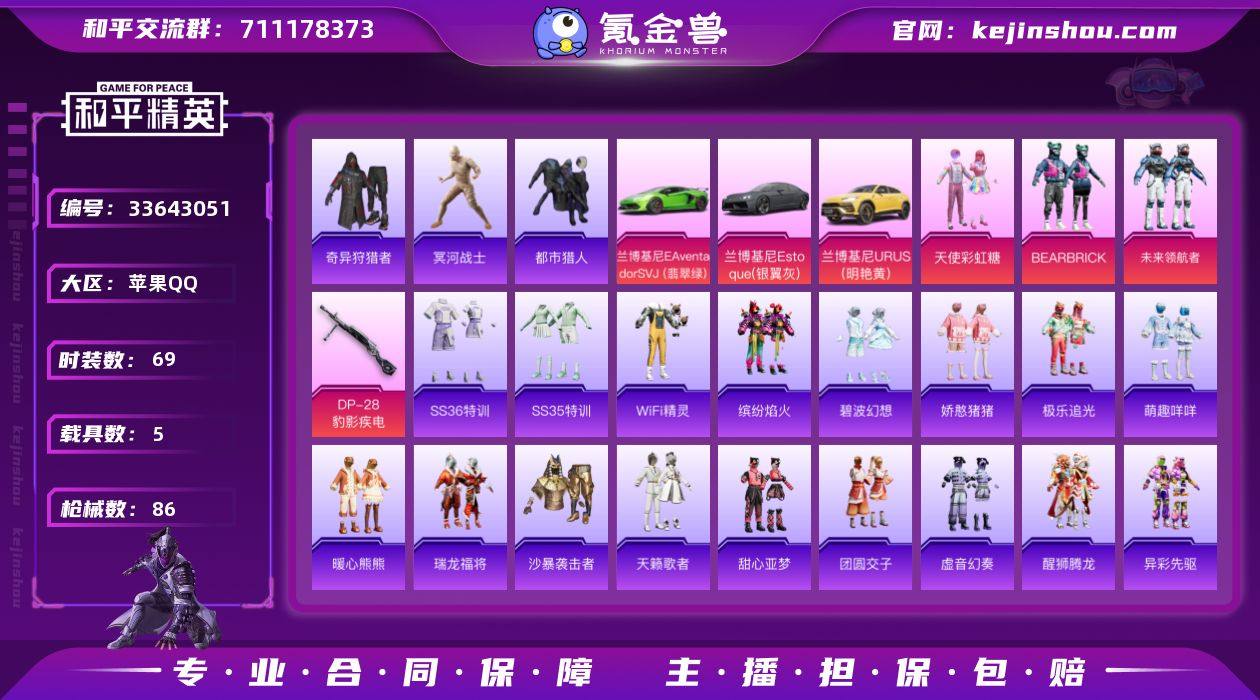 【和平精英】4粉装,7特效枪,4载具,历史最高段位:传奇王牌16星 王牌印记13次 热力值:60179,125套装,166枪械,181装备,90战备;套装:套装-天使彩虹糖,套装-梦幻火箭,套装-未来领航者,套装-BEARBRICK,套装-特训学院,套装-猎鹰,套装-青年教官,套装-橘黑制服,套装-红色运动,套装-黄色运动,套装-蓝色运动,套装-黄色伏地魔,套装-白色伏地魔,套装-黑色伏地魔,套装-竞技名士,套装-深蓝色名流,套装-酒红色名流,套装-湖蓝色名流,套装-黄色名流,套装-长空猛禽,套装-漫步者,套装-海岛探路者,套装-都市猎人,套装-浪漫天命,套装-特战装甲,套装-贵族骑装,套装-特殊使命,套装-沙漠毒蛇,套装-鹰眼刺客,套装-苍穹猎鹰,套装-冰冻风暴,套装-千禧之恋,套装-魅力单车,套装-绮丽涂鸦,套装-狂沙舞者,套装-热血青春,套装-极地朋克,套装-烈火街头,套装-幻世战舞者,套装-奇异狩猎者,套装-暗影哥特,套装-甜蜜熊情侣,套装-缤纷果语,套装-冰川特警,套装-格斗先锋,套装-WiFi精灵,套装-麻辣教官,套装-沙暴袭击者,套装-冥河战士,套装-粉红小猪,套装-破蛋小黄鸡,套装-霓虹街区,套装-激萌罗小黑,套装-大橘为重,套装-软萌银虎,套装-萌黄之夏,套装-...