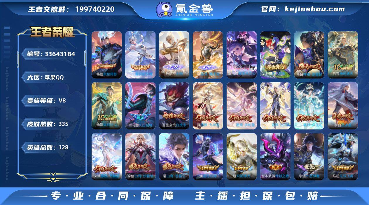 实名: 可修改 性别: 女号 贵族等级: V8 英雄数: 128 皮肤数: 335 荣耀水晶: 弑枪猎影,最初的交响 无双皮: 器灵·螭龙剑,无相 珍品传说: 时之奇旅-孙策,酷洛米之心 传说皮: 黄金射手座,冠军飞将,绛天战甲,炽阳神光,一念神魔,地狱火,地狱之眼,胖达荣荣,无双飞将,山海·炽霜斩,山海·苍雷引,澜逐花归海,幻光神枪,祥瑞亨通,九山相柳,神树通天,纵目迁山,神骥·逐星野 限定皮: 冰锋战神,李小龙,游园惊梦,梁祝,时雨天司,岱宗,天狼绘梦者,凤求凰,白虎志,至尊宝,如梦令-后羿,大圣娶亲,高山流水,猪悟能,玉兔公主,五谷丰年,怒海麟威,山海·玄木吟,鸣野蒿,愿照·千秋盛,愿照·众生和,愿照·山河定,愿照·岁时盈,愿照·九州拓 亮点: 【优质装备】:弑枪猎影(韩信典藏),器灵·螭龙剑,最初的交响(伽罗典藏),酷洛米之心,黄金射手座,冠军飞将,绛天战甲(鸡嘴战神),炽阳神光,一念神魔,地狱火,地狱之眼,胖达荣荣,无双飞将,山海·炽霜斩(李信年限),山海·苍雷引(电光曜子),澜逐花归海,涂山容容