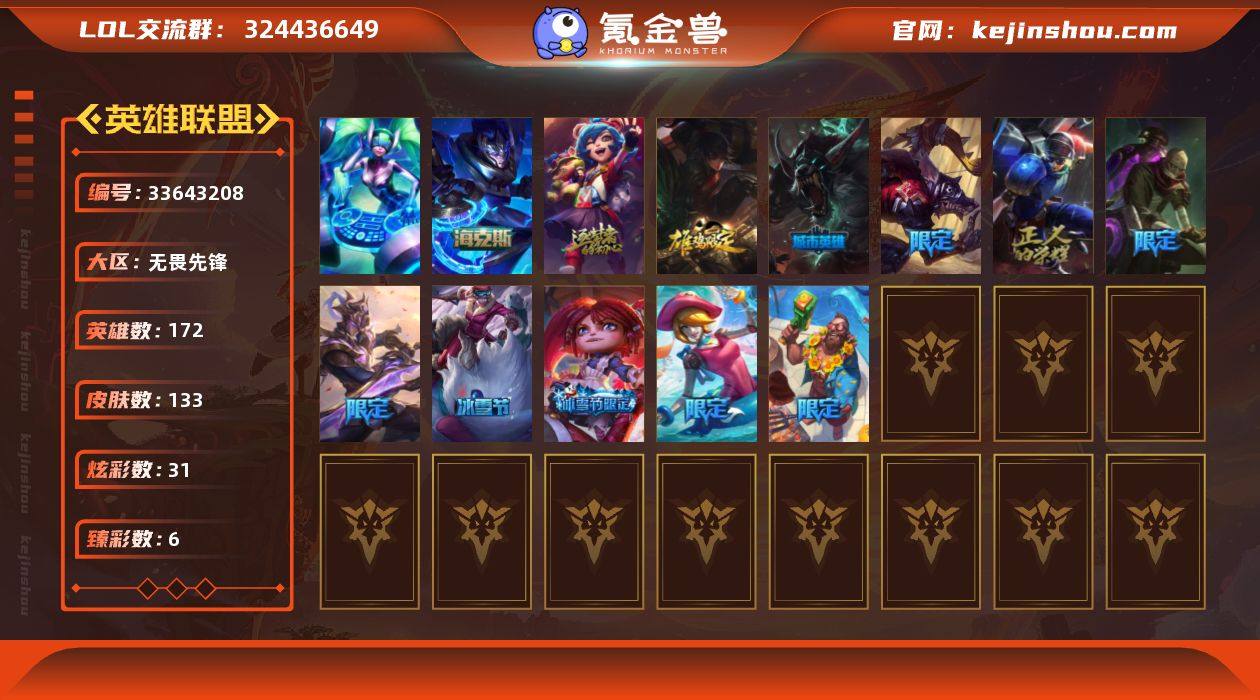 【LDC3492】172英雄/133皮肤/1终极/2神话/14限定/6臻彩/31炫彩/14传说/28史诗/未定级/10周年 安妮/海克斯 嘉文四世/无畏骑士 瑟庄妮 赤子初心/雾雨之刃 锐雯/源计划: 毁灭 派克 幻灭/泳池派对 奥莉安娜 优雅珠光鲸/破败军团 厄运小姐 灵岛征伐使/魔女 阿卡丽 虚荣/虎痴之拳 蔚/圣诞玩偶 波比/魄罗骑士 瑟庄妮/冰雪节 炼金/DJ-娑娜/暗裔英雄 盖伦/胜利剑圣 易/胜利女神-菲奥娜/死亡誓约 劫/泳池派对 奥莉安娜/泳池派对 普朗克/暗影 沃里克/都铎王朝 图奇/防暴天使 凯尔/双城之战2 微光实验室 辛吉德/地狱之门卫士 加里奥/钢铁之翼 凯尔/恶魔男爵 瑞兹/黎明使者索拉卡/欧米伽小队 幽灵特工/烈焰雄心 崔丝塔娜/女皇 艾希/律政大亨 蒙多/冰霜之刃 艾瑞莉娅/冰川巨兽 墨菲特/丧尸 布兰德/光明哨兵 薇恩/宇航员 诺提勒斯/霸天异形 卡兹克/天人合一 易/源代码 索拉卡/荒野豺狼 沃里克/少林武僧 贾克斯/死神 卡尔萨斯/侏罗纪化石 科加斯/熔火之心 拉莫斯/掠星魔刃 卡萨丁/海克斯科技 迦娜/抵抗军天使 凯特琳/铁血狙击手 凯特琳/符文战神 雷克顿/屠龙勇士 薇恩/苍穹之光 薇恩/钢铁烈阳 蕾欧娜/刺客信条 锐雯/侏罗纪化石 克格莫/钢之逆鳞 希瓦娜/海牛猎手 菲兹/暗黑武士 雷恩加尔/铁血帝...