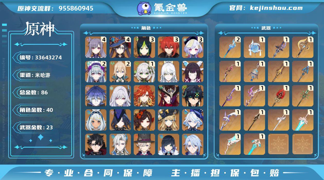【YSX1976】60级/86黄/女主/40个五星角色/23个五星武器/哥伦比娅/芙宁娜/一命纳西妲/菲林斯/兹白/娜维娅/钟离/恰斯卡/枫原万叶/温迪/丝柯克/莱欧斯利/甘雨/克洛琳德/雷电将军/基尼奇/三命提纳里/玛拉妮/那维莱特/夜兰/玛薇卡/林尼/宵宫/胡桃/可莉/三命迪卢克/千织/八重神子/珊瑚宫心海/神里绫人/二命梦见月瑞希/魈/二命琴/申鹤/迪希雅/三命七七/四命刻晴/四命莫娜/荒泷一斗/埃洛伊/最初的大魔术/飞雷之弦振/阿莫斯之弓/天空之翼/帷间夜曲/图莱杜拉的回忆/薙草之稻光/和璞鸢/护摩之杖/裁断/静水流涌之辉/息灾/赦罪/风鹰剑/贯虹之槊/天空之傲/赤沙之杖/天空之刃