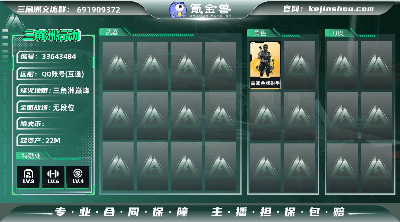 [18930873]总资产:22.5M 1干员外观 13传说枪械 哈夫币:397.002K 不可二次 不可修改实名 【烽火地带段位】三角洲巅峰 【全面战场段位】无段位 【干员外观】露娜-金牌射手(S7) 【传说武器皮肤】SG552突击步枪-运动员,M14射手步枪-电锯惊魂,SCAR-H战斗步枪-启航,SKS射手步枪-骑士,47突击步枪-悠然茶歇,AUG突击步枪-悠然茶歇,UZI冲锋枪-悠然茶歇,M14射手步枪-缄花,SR-25射手步枪-缄花,勇士冲锋枪-万金泪冠,腾龙突击步枪-万金泪冠,AWM狙击步枪-万金泪冠,.357左轮-缄花