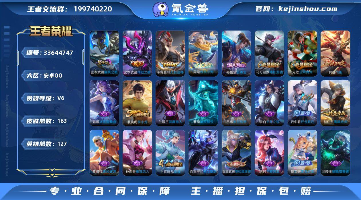 0BGHMQ可二次v6"""传说2优质限定2 钱包已注销、信用分正常、无设备脸 传说皮肤:地狱之眼,久胜战神, 史诗限定:飞衡,至尊宝, 周年皮肤:李小龙,梁祝, 珍宝阁:蔷薇恋人, 史诗皮肤:王者之锤,圣诞狂欢,末日机甲-吕布,乘风破浪,幽灵船长,苍穹之光,功夫厨神,德古拉伯爵,节奏热浪,千年之狐,暗隐猎兽者,原初追逐者,热力回旋,纤云弄巧,金属风暴,魅力维加斯,摇滚巨星,冰雪圆舞曲,圣诞恋歌,偶像歌手,水果甜心,鹰眼统帅,特工魅影,繁星吟游, "" " 贵族6 星传说1 传说皮肤2 史诗皮肤37 皮肤数量163 皮肤价值:91352 英雄127 永恒钻石II 总场次6502