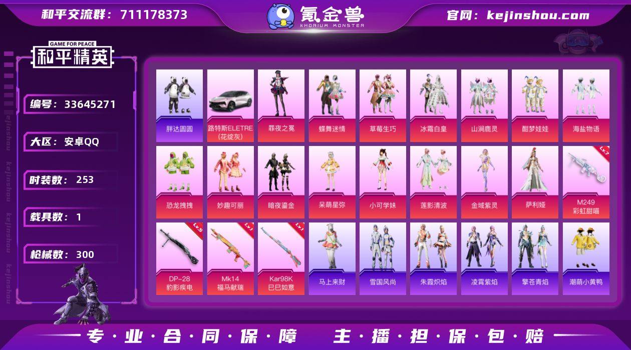 安卓 手Q-15粉装-4特效枪-1载具-3粉色飞行器-96980热力值-9王牌印记-253套装-300枪皮 【热门品类】:套装-浪漫天命,套装-胖达圆圆,套装-龟仙人,套装-潮萌小黄鸭,套装-粉红小猪 【粉色套装】:粉装-蝶舞迷情,粉装-草莓生巧,粉装-冰霜白皇,粉装-山涧鹿灵,粉装-酣梦娃娃,粉装-海盐物语,粉装-恐龙拽拽,粉装-妙趣可丽,粉装-暗夜鎏金,角色-呆萌星弥,角色-小可学妹,粉装-莲影清波,角色-金域紫灵,角色-萨利娅,角色-罪夜之冕 【粉色枪皮等级】:Kar98K-巳巳如意(一级),Mk14-福马献瑞(一级),M249-彩虹甜喵(七级),DP-28-豹影疾电(五级) 【粉色载具】:路特斯ELETRE(花绽灰) 【粉色枪皮】:Kar98K-巳巳如意,Mk14-福马献瑞,M249-彩虹甜喵,DP-28-豹影疾电 【粉色飞行器】:炫彩糖果飞行器,春暖花开飞行器,极意拳锋飞行器 【粉色降落伞】:金风玉露降落伞,繁花小夜曲降落伞,夏日绵绵冰降落伞,童趣迷兔降落伞,怪笑疯兔降落伞,暗夜玫瑰降落伞,蓝莓炮弹降落伞,橘柚倾心降落伞,暖熊萌萌降落伞,彩虹甜喵降落伞,旋转彩虹降落伞,第五大道降落伞,仲夏莫吉托降落伞,飒粉甜心降落伞,白勺歌姬降落伞,闲梦青缨降落伞,莲影清波降落伞,圣堂之誓降落伞,精灵梦...
