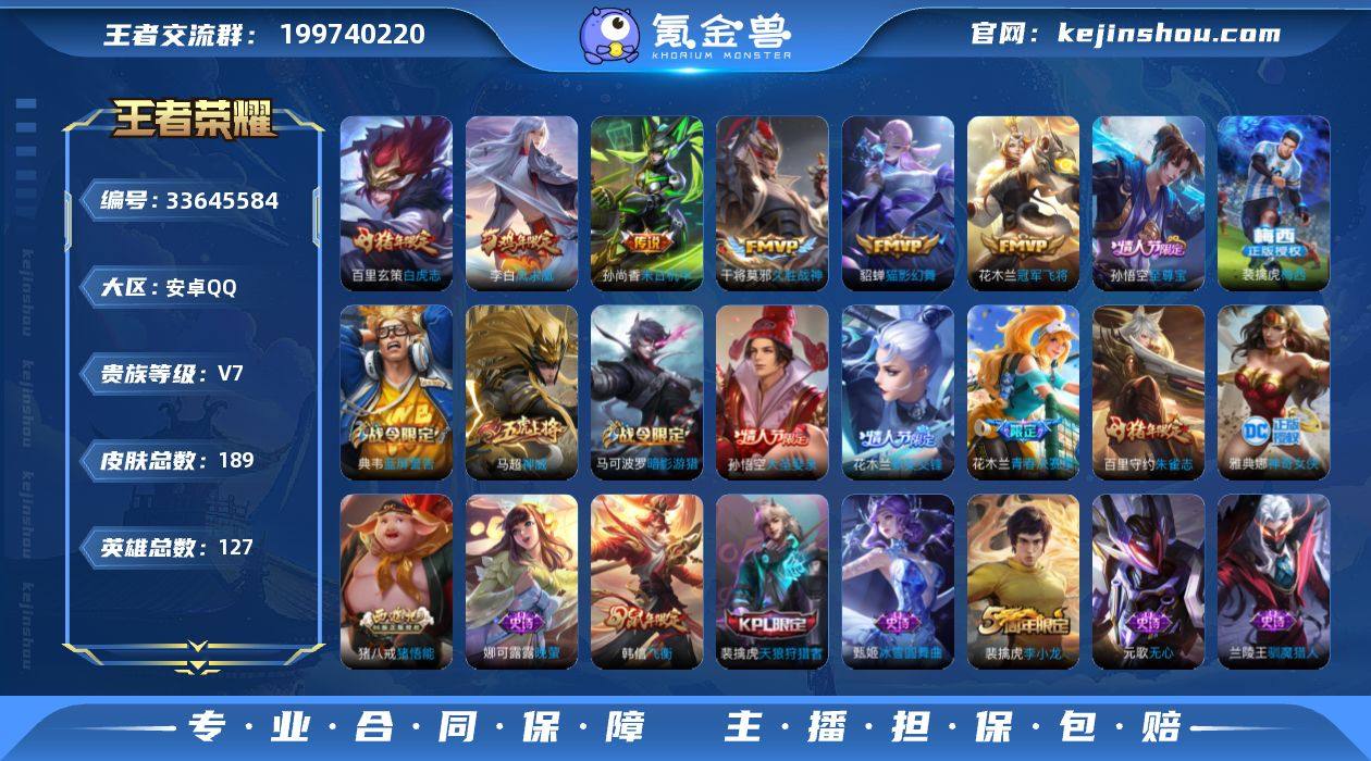 实名: 可修改 性别: 女号 贵族等级: V7 英雄数: 127 皮肤数: 189 传说皮: 冠军飞将,猫影幻舞,久胜战神,末日机甲-孙尚香 限定皮: 李小龙,梁祝,神威,飞衡,青春决赛季,天狼狩猎者,神奇女侠,凤求凰,白虎志,瑞麟志,朱雀志,梅西,至尊宝,大圣娶亲,默契交锋-花木兰,霸王别姬-虞姬,高山流水,猪悟能,五谷丰年 亮点: 【优质装备】:冠军飞将,猫影幻舞,久胜战神,末日机甲-孙尚香(绿蚂蚱)