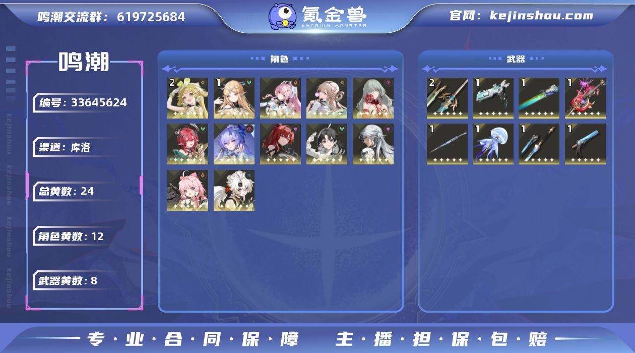 男/女主: 男主 总黄数: 24 联觉等级: 74 拥有五星共鸣者: 鉴心,卡卡罗,安可,维里奈,凌阳,吟霖,坎特蕾拉,夏空,卡提希娅,弗洛洛,琳奈,爱弥斯 2鸣五星共鸣者: 2鸣维里奈 1鸣五星共鸣者: 1鸣卡提希娅 0鸣五星共鸣者: 0鸣鉴心,0鸣卡卡罗,0鸣安可,0鸣凌阳,0鸣吟霖,0鸣坎特蕾拉,0鸣夏空,0鸣弗洛洛,0鸣琳奈,0鸣爱弥斯 拥有五星武器: 千古洑流,停驻之烟,海的呢喃,血誓盟约,不屈命定之冠,幽冥的忘忧章,溢彩荧辉,源能机锋 2鸣五星武器: 2鸣血誓盟约 1鸣五星武器: 1鸣千古洑流,1鸣停驻之烟,1鸣海的呢喃,1鸣不屈命定之冠,1鸣幽冥的忘忧章,1鸣源能机锋,1鸣溢彩荧辉 亮点: 【MC343】74级/24黄/男主/12个五星角色/8个五星武器未绑定,爱弥斯,夏空,卡提希娅,弗洛洛,琳奈,坎特蕾拉,吟霖,维里奈,卡卡罗,鉴心,安可,凌阳,溢彩荧辉,源能机锋,幽冥的忘忧章,不屈命定之冠,海的呢喃,血誓盟约,千古洑流,停驻之烟,2命维里奈,1命卡提希娅,0命爱弥斯,0命夏空,0命弗洛洛,0命琳奈,0命坎特蕾拉,0命吟霖,0命卡卡罗,0命鉴心,0命安可,0命凌阳,精2血誓盟约,精1溢彩荧辉,精1源能机锋,精1幽冥的忘忧章,精1不屈命定之冠,精1海的呢喃,精1千古洑流,精1停驻之烟