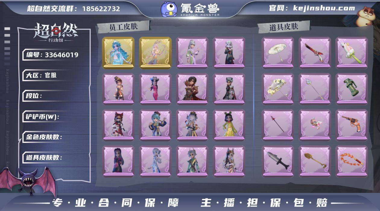 金皮2;紫皮14;道具皮21;皮肤:逍遥-莲华渡,薇薇安-海月息潮,爱丽丝-耀眼的你,逍遥-泽引山海,逍遥-万迭云华,阿念-迷途僵宝,零-搬开山,爱丽丝-丝缕哀歌,莉莉-除妖小师妹,小黄-呱呱雨衣,艾伦-黎明猎手,爱德华-梵卓之礼,莉莉-,薇薇安-白光莹,巫铃儿-素影瑶光,阿念-庆宴绮愿;道具:闪光弹-金戈玄铜,刺刀-,音响-鸣沙鼓,摸金符-紫霄,转轮手枪-新星时代,长枪-罪棘,电击枪-甜蜜泡泡枪,伞-郁金春信,刺刀-小鲨匕首,长鞭-飞天绫,急救包-蔷薇物语,长鞭-缚誓之锁,伞-沐春颂,长鞭-新春炸响,铲子-龙鳞,短管猎枪-安魂曲,长枪-波塞冬,腰包-宝剑八,音响-月光奏鸣曲,腰包-惊魂娃娃,伞-伞;美妆:美妆-暗夜小恶魔;饰品:头饰-烈焰红唇头套,头饰-烛光纪念,头饰-蒜了八,头饰-青团糯糯,头饰-卑微头套,头饰-饺饺者头套,头饰-马上有钱,头饰-咬咬鲨头套,头饰-呆滞头套,头饰-大葱明头套,头饰-火爆了头套,头饰-芝麻糊汤圆,头饰-哈士奇头套,头饰-小羊的王子梦,头饰-炙热烧烤,头饰-萨卡班甲鱼头套,头饰-滑稽头套,头饰-雪墩墩头套,头饰-精致露比头套,头饰-面具马头套,头饰-鱼头怪头套,头饰-太空鲨头套,头饰-煤球喵头套,头饰-樱桃奶油布丁,头饰-嘻嘻头套,头饰-惊魂南瓜头套,头饰-像素朋克墨镜,头饰-后室幸...