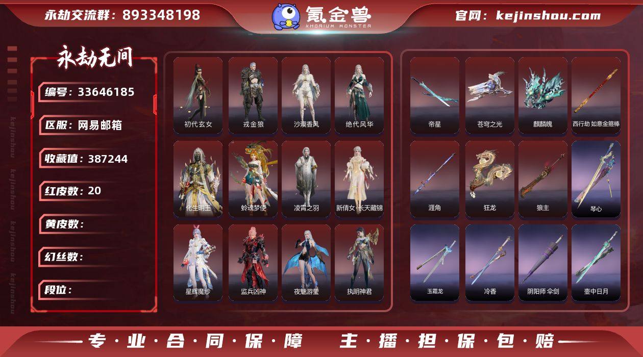 YJJ2372/5.13换绑/等级451/s20三人白银1/22红494金收藏值387244/22红色神品:/初代玄女/星辉魔纱/化生明王/长天藏锦/戎金狼/蛉魂梦使/凌霄之羽/绝代风华/沙漠香风/监兵凶神/夜魅游莹/执明神君/守墨麒/麒麟魄/帝星/烈阳_/狼主/涯角/如意金箍棒/狂龙/苍穹之光/【技能奥义】/噬骨/剪纸彩刀/揽九天/霜翎/彩俑娃娃 宁红夜:/初代玄女/耀世魂花/霜天红叶/夜华朝/紫金玉女/相柳/蜘蛛精/玄豹姿/九阴圣女/簪缨发/双马尾女 沈妙:/星辉魔纱/絮云衣/涂鸦少女/悠竹萌客/云溪仙子/紫衣仙子/百灵发/娇憨发/双马尾女 天海:/化生明王/夏海伏浪/九骊之君/若水尊者/枫行者/八宝龙王/双马尾男 殷紫萍:/长天藏锦/风雨谐/萍之缘/沐昭/流纨裙/兰庭月/紫芙发/子菀发/伏苓发/双马尾女 特木尔:/戎金狼/银狼裘/唐三/龙虎斗/噬月天狼/苍狼宗主发/漠月发/海神发/双马尾男 季沧海:/龙心炽焰/杰洛特/信手斩龙/精武魂/江海羲炎/瑞火麟/孽炎祸斗/游四海/腾烟发/江海发/炮炼发/白狼发/双马尾男 胡桃:/高校水着/辉烨少女/山吹茶/主祭者/月丹发/月下香发/木棉发/双马尾女 妖刀姬:/蛉魂梦使/热海白珊/流火映真 崔三娘:/暗沼摩罗/敖丙/巨鲸客/文鳐/掌珠仙子/无拘/赤雾烟霞/弄潮逐浪/沸海发/填海发/弄潮发/碎浪发/安澜发...
