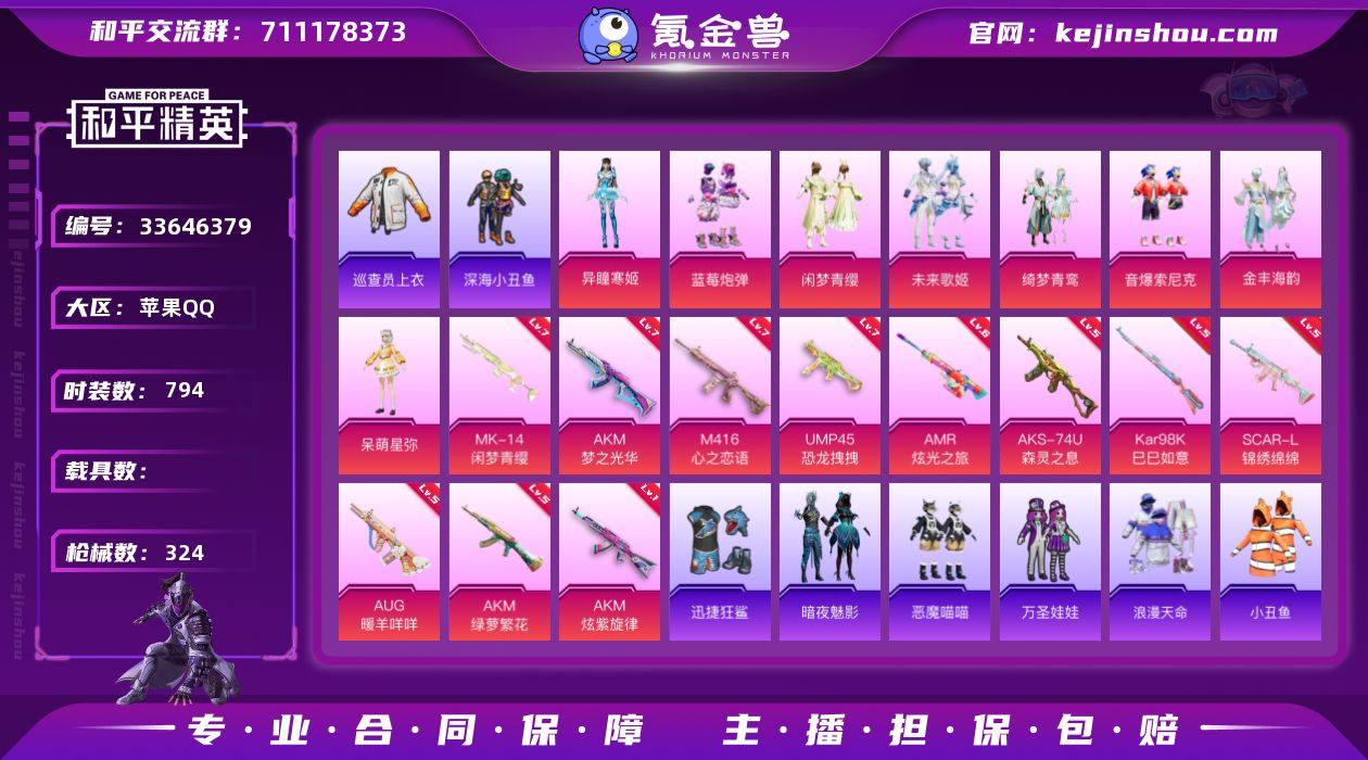 【特价出售】苹果Q-4稀有8粉装13特效枪25热门219套装324枪皮 100604热力值 18印记 历史卓越王牌16星 【4稀有】 巡查衣 M416-黄金龙骨 AWM-黄金龙骨 浪漫天命 【8粉装】 金丰海韵 异瞳寒姬 未来歌姬 呆萌星弥 闲梦青缨 绮梦青鸾 音爆索尼克 蓝莓炮弹 【13特效枪】 SCAR-L-锦绣绵绵 (5级) M416-心之恋语 (7级) AKM-炫紫旋律 (1级) AKS-74U-森灵之息 (5级) AKM-绿萝繁花 (5级) Kar98K-巳巳如意 (5级) AUG-暖羊咩咩 (5级) Mk14-闲梦青缨 (7级) AMR-炫光之旅 (6级) AKM-梦之光华 (7级) Mk14-福马献瑞 (4级) ACE32-萌骑漫游 (3级) UMP45-恐龙拽拽 (7级) 【25热门】 小丑鱼 龟仙人 暗夜之虎 浪漫假日 万圣娃娃 恶魔喵喵 暗夜之虎 迅捷狂鲨 深海小丑鱼 梦起落英 醒狮腾龙 团圆交子 瑞龙福将 纯白誓言 漫步者 破蛋小黄鸡 英勇保护者 弄潮海豚 M762-奇异狩猎者 M762-瑞龙福将 M24-奇异狩猎者 S686-奇异狩猎者 Mini14-林间仙鹿 汤姆逊-林间仙鹿 GROZA-林间仙鹿 【5飞行器】 暗翼战神飞行器 绮梦青鸾飞行器 王牌四分卫飞行器 祥瑞锦鲤飞行器 萌物绒绒飞行器 【2头盔】 幻影战神头盔 深海小丑鱼头盔 【2背包】 萌熊伴侣背包 深海小丑鱼背包
