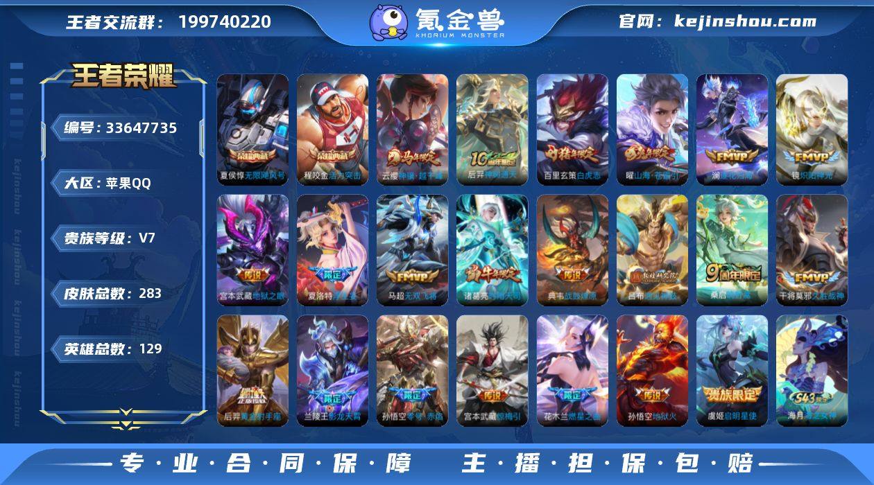 苹果Q-V7-至尊星耀III段位-129英雄-283皮肤-2典藏皮肤-21传说-86史诗 【荣耀典藏】:夏侯惇无限飓风号,程咬金活力突击 【传说皮肤】:云缨神骥越千峰,后羿神树通天,桑启鸣野蒿,典韦战鼓燎原,澜逐花归海,兰陵王影龙天霄,吕布遇见神鼓,宫本武藏惊梅引,夏洛特浮生妄,花木兰燃星之曲,曜山海苍雷引,马超无双飞将,诸葛亮时雨天司,镜炽阳神光,虞姬启明星使,孙悟空零号赤焰,干将莫邪久胜战神,百里玄策白虎志,后羿黄金射手座,宫本武藏地狱之眼,孙悟空地狱火 【限定皮肤】:姜子牙天穹之誓,狄仁杰阴阳师,赵云皇家上将,墨子神迹守卫,嬴政优雅恋人,庄周云端筑梦师,高渐离玩趣恶龙,钟无艳王者之锤,孙膑天狼运算者,吕布遇见神鼓,元歌云间偶戏,元歌无心,马可波罗暗影游猎,狄仁杰魔术师,狄仁杰万华元夜,达摩星际陆战队,达摩沙漠行僧,项羽海滩派对,老夫子醍醐杖,老夫子航海奇遇记,关羽百相守梦,程咬金演武夺筹,兰陵王影龙天霄,兰陵王金庭之子,花木兰青春决赛季,花木兰默契交锋,花木兰燃星之曲,亚瑟潮玩骑士王,孙悟空大圣娶亲,孙悟空零号赤焰,刘备百相守梦,李元芳云中旅人,虞姬霸王别姬,虞姬启明星使,钟馗驱傩正仪,杨玉环遇见飞天,雅...