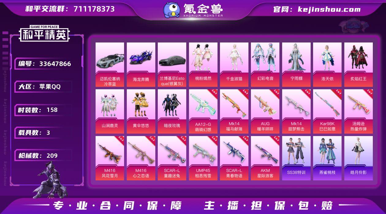 可二次【12特效枪9粉装3载具 秒换绑不用等】 苹果Q区-72965热力值-158套装-209枪皮 【3载具】 兰博基尼Estoque(银翼灰) 海龙奔腾 迈凯伦塞纳(冷萃蓝)【3稀有】 攀登者外套/裤子 AWM-黄金龙骨 8号机粉螳螂【9粉装】 洛天依 暗夜玫瑰 山涧鹿灵 炙焰红王 黄伞悠悠 角色-宁雨蝶 桃粉嫣然 幻彩电音 角色-千金淑猫【12特效枪】 M416-心之恋语(1级) M416-风花雪月(7级) Mk14-福马献瑞(1级) AA12-G-萌骑幻想(4级) SCAR-L-青春物语(1级) AKM-星际浪客(7级) SCAR-L-童趣迷兔(5级) UMP45-相思残雪(5级) 汤姆逊-热量炸弹(4级) Kar98K-巳巳如意(5级) Mk14-甜梦熊击(5级) AUG-暖羊咩咩(5级)【218热门】 醒狮腾龙 团圆交子 瑞龙福将 忍者信条 M416-仓鼠灰灰 SS9特训 SS3特训 SS2特训 SS22特训 Mk47-洛神天依 M762-乌木金纹 Kar98K-王子的夏天 SCAR-L-玉兔迎春 AUG-幻影战神 M762-天降萌叽 Mk47-乌木金纹 UZI-娇憨猪猪 MG3-幻世战舞者 AKM-虎虎生威 AKM-霓虹街区 M16A4-魔法学院 呆萌铁蟹 M416-蓝色火焰 软萌银虎 破蛋小黄鸡 长空猛禽 虚音幻奏 甜心亚梦 青涩时光 奇趣企鹅 魅力单车 拉斐尔 竞技勇士朋克 灰色格斗者 风暴特警 纯真浪花 M762-瑞龙福将 汤姆逊-智耀战神 创世·幻影 AA12-G-雨过天...