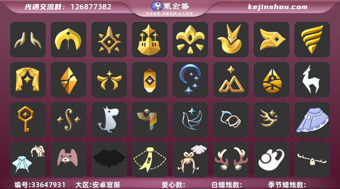 账号类型: 手机账号 季节已毕业: 圣岛季,预言季,梦想季,小王子季,风行季,潜海季,表演季,破晓季,欧若拉季,集结季,夜行季,追忆季,拾光季,归巢季,九色鹿季,筑巢季,二重奏季,姆明季,彩染季,青鸟季,双星季,迁徙季,织光季 完成地图: 晨岛,云野,雨林,霞谷,暮土,禁阁,全图毕业 珍稀物品: 阿努比斯(狗头),白枭,透明蝶翼斗,玫瑰花 礼包: 蝙蝠套,围巾,绊爱,鹿角,兔子鞋,跷跷板,奔跑裤子,奔跑发型,鲤鱼套,橘子,贝壳,红伞,兔子,鲤鱼,tgc,新年裤,四叶草,创始人,日光耳环,满月耳坠,小狗周年发饰,青衫落拓礼包,金穗披肩斗篷礼包 裤子: 武士裤,背带裤,白棉裤,搓澡巾 面具: 黄鼠狼,红狐狸,阿努比斯 面饰: 红耳机,黑框眼镜 项链: 围巾 发型: 蝴蝶结,正太,樱花,公主头,虚荣,猫耳,白枭 头饰: 花环 斗篷: 白金,红金,白鸟斗,花瓣斗篷,荧蓝斗篷,玫瑰褶边斗篷 配饰: 雨伞,排箫,高音钢琴,吉他,笛子,大铃铛乐器,乐器 亮点: 重塑药水267,有织光季季卡