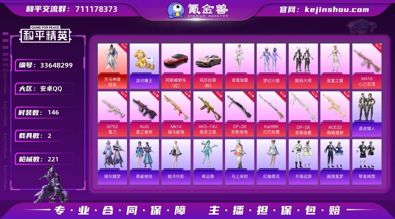 梦幻火箭+红眼罩+金鞋子+可二次安卓 手Q-1神装-4粉装-9特效枪-2载具-3粉色飞行器-69867热力值-15王牌印记-146套装-221枪皮TD2641805 【红色神装等级】:天马神君-驭风(一级) 【红色角色神装】:天马神君-驭风 【热门品类】:粉装-梦幻火箭,套装-派对舞王,套装-小丑鱼,套装-暗影哥特 【粉色套装】:粉装-数码大师,粉装-梦幻火箭,角色-圣堂之誓,角色-鸢尾珑雾 【粉色枪皮等级】:M416-心之恋语(七级),AUG-星之彼岸(六级),M762-鬼刀(七级),ACE32-萌骑漫游(二级),AKS-74U-森灵之息(五级),Kar98K-巳巳如意(五级),Mk14-福马献瑞(五级),DP-28-豹影疾电(五级),DP-28-鸢尾珑雾(三级) 【粉色载具】:阿斯顿马丁DBS(红),玛莎拉蒂Ghibli(粉) 【粉色枪皮】:M416-心之恋语,AUG-星之彼岸,M762-鬼刀,ACE32-萌骑漫游,AKS-74U-森灵之息,Kar98K-巳巳如意,Mk14-福马献瑞,DP-28-豹影疾电,DP-28-鸢尾珑雾 【粉色飞行器】:炫彩糖果飞行器,梦幻火箭飞行器,王牌四分卫飞行器 【粉色降落伞】:心之恋语降落伞,荧光虫舞降落伞,王牌四分卫降落伞,梦之光华降落伞,暗夜玫瑰降落伞,环太平洋降落伞,玉鳞金羽降落伞,无垠阁降落伞,魔童闹海 哪吒降落伞,虎痴许褚降落伞,...