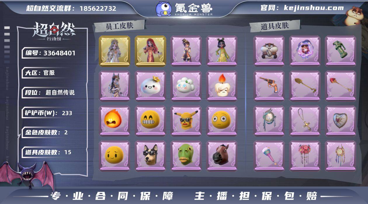 ZR959,金皮:2,紫皮:3,道具皮:15,外观:薇薇安-圣光之谕,巫铃儿-镜花辞,薇薇安-白光莹,小黄-呱呱雨衣,阿念-庆宴绮愿,道具:铲子-圣心之泪,闪光弹-金戈玄铜,折扇-露露扇,额外的背包-飞花令,摸金符-祝祷词,专业手电-云端梦想计划,传送按钮-昆仑镜,音响-鸣沙鼓,音响-happy猫,转轮手枪-新星时代,急救包-土拨鼠捏捏,铲子-龙鳞,腰包-宝剑八,喷气背包-乘风溯雪,急救包-蔷薇物语,饰品:头饰-滑稽头套,头饰-鱼头怪头套,头饰-火爆了头套,头饰-大葱明头套,头饰-嘻嘻头套,头饰-烈焰红唇头套,头饰-呆滞头套,头饰-饺饺者头套,头饰-哈士奇头套,头饰-面具马头套,头饰-烛光纪念,头饰-萨卡班甲鱼头套,头饰-卑微头套,头饰-芝麻糊汤圆,头饰-像素朋克墨镜,头饰-后室幸存者头套,挂饰-未竟乐园,挂饰-钗头凤,挂饰-小鲨包包,挂饰-天使消失的年代,背饰-蝶恋花,背饰-牛啤背包,背饰-天使的呼唤,动作:动作-鹏友摇,动作-新年摇,动作-舞台中心,动作-心跳摇,动作-luvaboy,动作-举牌,动作-拜年,动作-抬手,工牌背景:工牌背景-卷珠帘,工牌背景-冰晶宫,工牌背景-流金照庭,工牌背景-圣光之誓,工牌背景-心同野鹤,工牌动作:工牌动作-虔诚之姿,员工:爱德华,巫铃儿,爱丽丝,阿念,兰,艾伦,逍遥,临云,零,小黄,莉莉,薇薇安,累充1...