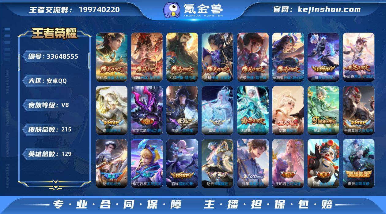 安卓Q-V8-至尊星耀II段位-129英雄-215皮肤-25传说-64史诗 【英雄全皮】:敖隐全皮,阿古朵全皮,海诺全皮 【传说皮肤】:云缨神骥越千峰,关羽神骥镇沧海,朵莉亚神骥鸣幻洲,狄仁杰神骥赴朔漠,貂蝉神骥聚万邦,马超神骥逐星野,桑启鸣野蒿,貂蝉曦玄引,孙尚香乘龙问璇玑,铠琥珀纪元,澜逐花归海,露娜霜月吟,马可波罗妄想实况,孙策挚爱之约,赵云淬星耀世,王昭君乞巧织情,诸葛亮时雨天司,铠绛天战甲,镜炽阳神光,虞姬启明星使,李信一念神魔,貂蝉猫影幻舞,干将莫邪久胜战神,梦奇胖达荣荣,宫本武藏地狱之眼 【限定皮肤】:蒙犽顽岩魄,蔡文姬夏日便利店,大乔绒语心约,虞姬夏日便利店,姜子牙天穹之誓,狄仁杰阴阳师,赵云皇家上将,赵云百木心枪,甄姬落雪兰心,典韦岱宗,马可波罗妄想实况,狄仁杰魔术师,项羽海滩派对,韩信傲雪梅枪,孙悟空孙行者,后羿如梦令,虞姬启明星使,钟馗神迹守卫,诸葛亮时雨天司,百里玄策原初追逐者,云中君纤云弄巧,孙策挚爱之约,上官婉儿梁祝,嫦娥拒霜思,艾琳流音漫舞,司空震地狱燃心,阿古朵江河有灵,张良古海寻踪,蒙犽百解令,高渐离燃音魔法,妲己灵卜魔法,鬼谷子天穹祈灯,铠琥珀纪元,姬小满妄想食味,孙尚香乘...