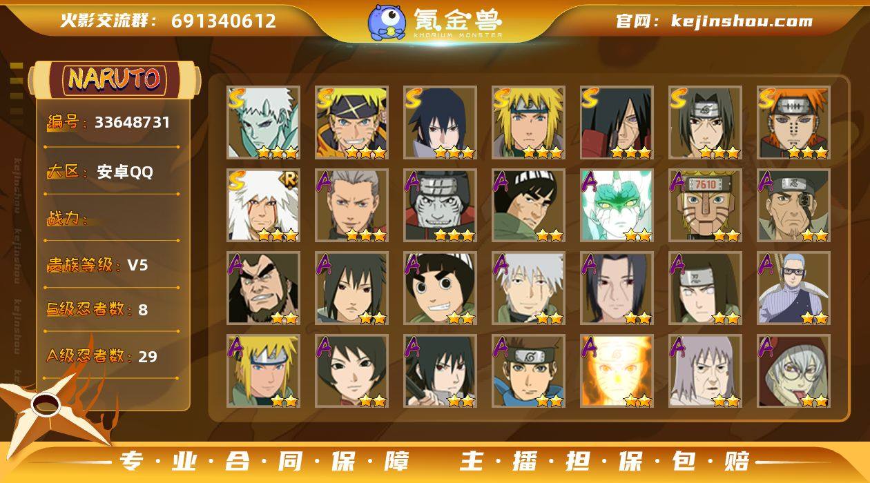 【HYYT507】VIP等级V5/S忍数量8/A忍数量29/三星S-宇智波斑「秽土转生」/二星A-日向宁次·忍界大战/二星A-我爱罗「疾风传」/三星S-宇智波带土「十尾人柱力」/二星A-飞段「死司凭血」/三星S-宇智波佐助「永恒万花筒」/二星A-迈特凯/2星小南「神驹佑将」/三星A-飞段/二星A-蝎/三星S-佩恩「天道」/三星S-漩涡鸣人·宇智波佐助/三星S-波风水门/二星A-秋道丁次「忍界大战」/三星A-干柿鬼鲛/二星A-李洛克「忍界大战」/二星A-土台「忍界大战」/2星旗木卡卡西「神威对决」/二星A-长十郎「六代目水影」/二星A-波风水门 「青年」/三星S-自来也「舞之豪杰」/2星迪达拉「晓创生」/二星A-黑土「四代目土影」/二星A-药师兜「半蛇斗篷」/二星A-神农 「羁绊」/二星A-猿飞阿斯玛/二星A-宇智波鼬 「夏日限定」/二星A-宇智波泉奈/二星A-旗木卡卡西 「幻之真容」/二星A-巳月「仙人模式」/二星A-漩涡鸣人「九尾查克拉」/二星A-迈特凯「青春爆炸」/二星A-宇智波佐助「须佐能乎」/二星A-猿飞木叶丸「博人传」/二星A-机械鸣人「初始形态」/二星A-千代「近松十人卫」/三星S-宇智波鼬 「须佐能乎」
