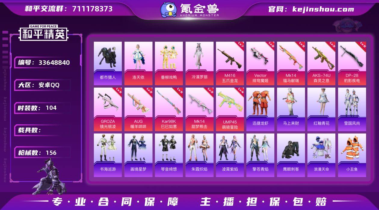 安卓 手Q-3粉装-10特效枪-0载具-1粉色飞行器-47492热力值-1王牌印记-104套装-156枪皮 【热门品类】:套装-浪漫天命,套装-都市猎人,套装-小丑鱼,套装-龟仙人 【粉色套装】:角色-洛天依,粉装-垂柳戏鸭,角色-冷漠罗丽 【粉色枪皮等级】:M416-五爪金龙(七级),GROZA-镜光银凌(五级),AUG-暖羊咩咩(五级),UMP45-萌骑冒险(四级),Vector-绯穹魔姬(六级),AKS-74U-森灵之息(五级),Kar98K-巳巳如意(五级),Mk14-甜梦熊击(五级),Mk14-福马献瑞(五级),DP-28-豹影疾电(五级) 【粉色枪皮】:M416-五爪金龙,GROZA-镜光银凌,AUG-暖羊咩咩,UMP45-萌骑冒险,Vector-绯穹魔姬,AKS-74U-森灵之息,Kar98K-巳巳如意,Mk14-甜梦熊击,Mk14-福马献瑞,DP-28-豹影疾电 【粉色飞行器】:炫彩糖果飞行器 【粉色降落伞】:洛神天依降落伞,彩虹甜喵降落伞,江南烟雨降落伞,千金淑猫降落伞,喜羊羊与灰太狼降落伞,炫彩糖果降落伞 【稀有套装】:套装-龟仙人,套装-巳巳如意,套装-雪国风尚,套装-炫彩糖果,套装-马上来财,套装-迅捷龙虾,角色-光矢逐梦,套装-燕燕于飞,套装-鱼渊荷华,套装-晶辉守护,套装-霓虹热舞,套装-云朵鹅,套装-雪绒豹,套装-朱霞炽焰,套装-凌霄紫焰,套装-...