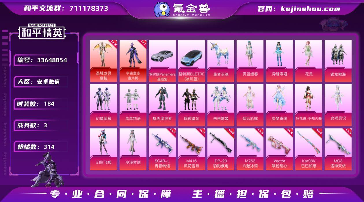 【LHPD211】【特价出售/店主推荐】安卓 微信-2神装-15粉装-11特效枪-3载具-7粉色飞行器-105417热力值-14王牌印记-184套装-314枪皮【红色神装等级】:圣域龙灵-瑞拉(三级),宇宙意志-塞卢姆(一级)【红色角色神装】:圣域龙灵-瑞拉,宇宙意志-塞卢姆【热门品类】:套装-龟仙人,套装-粉红小猪,角色-8号机,角色-Mark.06【粉色套装】:粉装-银龙傲海,粉装-幻情紫藤,粉装-岚岚物语,角色-复仇流浪者,粉装-暗夜鎏金,粉装-未来歌姬,角色-烟云彩露,角色-星梦奇缘,角色-狂花道·不知火舞,角色-女娲灵识,粉装-幻影飞狐,角色-冷漠罗丽,角色-花灵,角色-异瞳寒姬,角色-霁蓝缠春【粉色枪皮等级】:SCAR-L-青春物语(七级),M416-风花雪月(七级),M762-冷魅冰骑(五级),UZI-绮梦青鸾(四级),UMP45-宇宙意志(三级),Vector-飒粉甜心(五级),Kar98K-巳巳如意(五级),Kar98K-圣域龙灵(三级),DP-28-豹影疾电(五级),MG3-洛神天依(五级)【粉色载具】:路特斯ELETRE(冰川蓝),保时捷Panamera(星辰紫),星梦玉骢【粉色枪皮】:SCAR-L-青春物语,M416-风花雪月,M762-冷魅冰骑,UZI-绮梦青鸾,UMP45-宇宙意志,Vector-飒粉甜心,Kar98K-巳巳如意,Kar98K-圣域龙灵,DP-28-豹影疾电...