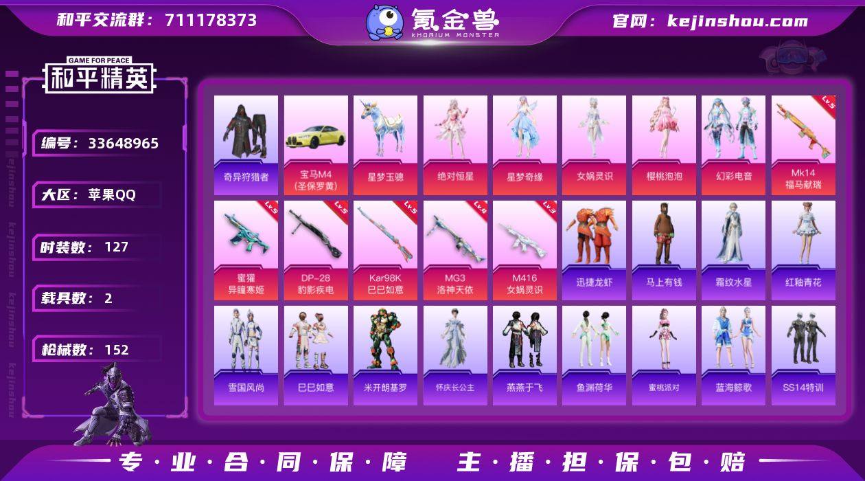 【A11745】苹果【小号/一套绝世印记/M416-女娲灵识(三级)/5粉装-6特效枪-2载具-4粉色飞行器】 手Q--49596热力值-9王牌印记-127套装-152枪皮 【热门品类】:套装-奇异狩猎者 【粉色套装】:角色-绝对恒星,角色-星梦奇缘,角色-女娲灵识,角色-樱桃泡泡,粉装-幻彩电音 【粉色枪皮等级】:M416-女娲灵识(三级),蜜獾-异瞳寒姬(五级),Kar98K-巳巳如意(五级),Mk14-福马献瑞(五级),DP-28-豹影疾电(五级),MG3-洛神天依(四级) 【粉色载具】:宝马M4(圣保罗黄),星梦玉骢 【粉色枪皮】:M416-女娲灵识,蜜獾-异瞳寒姬,Kar98K-巳巳如意,Mk14-福马献瑞,DP-28-豹影疾电,MG3-洛神天依 【粉色飞行器】:香车宝马飞行器,炫彩糖果飞行器,星梦奇缘飞行器,戏水时光飞行器 【粉色降落伞】:绝对恒星降落伞,洛神天依降落伞,橘柚倾心降落伞,垂柳戏鸭降落伞,第五大道降落伞,星梦奇缘降落伞,临安公主降落伞,脆鲨七海降落伞,圣斗士星矢降落伞,绯穹魔姬降落伞,喜羊羊与灰太狼降落伞,异瞳寒姬降落伞,炫彩糖果降落伞,罪夜之冕降落伞 【稀有套装】:套装-巳巳如意,套装-雪国风尚,套装-炫彩糖果,套装-马上有钱,套装-迅捷龙虾,角色-米开朗基罗,角色-怀庆长公主,套装-燕燕...