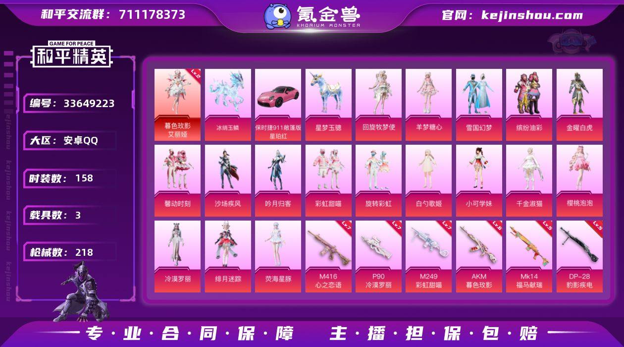 【LHPX1247】【特价出售/店主推荐】安卓 手Q-1神装-17粉装-13特效枪-3载具-7粉色飞行器-81569热力值-9王牌印记-158套装-218枪皮 【红色神装等级】:暮色玫影-艾丽娅(二级) 【红色角色神装】:暮色玫影-艾丽娅 【热门品类】:粉装-雪国幻梦,粉装-缤纷油彩,套装-糯粉咩咩,套装-软软马卡龙,套装-红熊茄茄 【粉色套装】:粉装-金曜白虎,粉装-雪国幻梦,粉装-缤纷油彩,粉装-馨动时刻,粉装-沙场疾风,粉装-吟月归客,粉装-彩虹甜喵,粉装-旋转彩虹,角色-白勺歌姬,角色-小可学妹,角色-千金淑猫,角色-樱桃泡泡,角色-冷漠罗丽,角色-绯月迷踪,角色-荧海星豚,角色-羊梦糖心,角色-回旋牧梦使 【粉色枪皮等级】:AKM-梦之光华(五级),AKM-暮色玫影(六级),M416-心之恋语(七级),M416-风花雪月(三级),ACE32-萌骑漫游(二级),ARX-无垠阁(四级),汤姆逊-热量炸弹(五级),P90-冷漠罗丽(七级),P90-魔童闹海 敖丙(三级),Mk14-福马献瑞(五级),M249-彩虹甜喵(七级),DP-28-豹影疾电(五级),MG-36-沧焰双生(五级) 【粉色载具】:保时捷911 敞篷版(星珀红),星梦玉骢,冰绡玉鳞 【粉色枪皮】:AKM-梦之光华,AKM-暮色玫影,M416-心之恋语,M416-风花雪月,ACE32-萌骑漫游,ARX-...