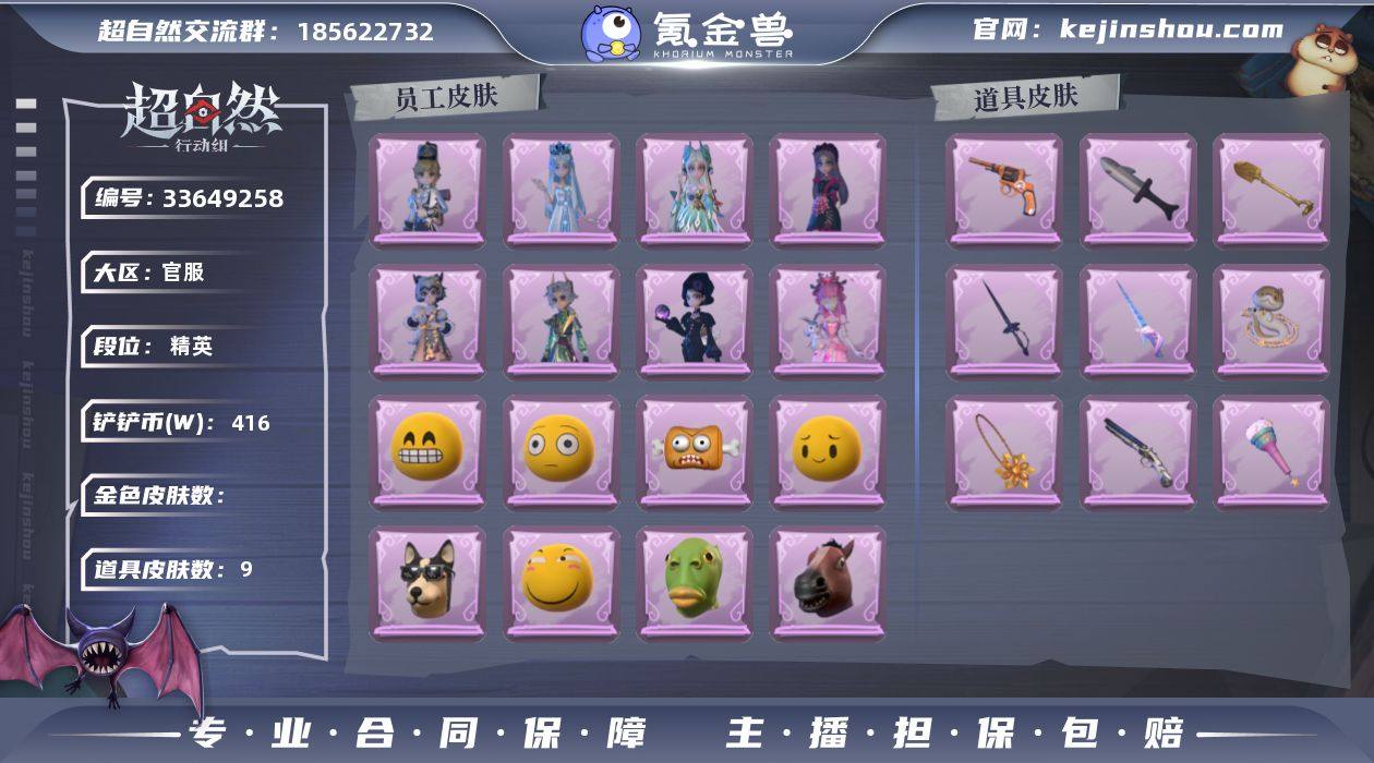 ZR971,紫皮:8,道具皮:9,外观:爱丽丝-冰公主,爱丽丝-瑞羽衔春,逍遥-泽引山海,小黄-霓裳踏雪,莉莉-情公主,爱丽丝-丝缕哀歌,阿念-王子与骑士,薇薇安-黑月挽歌,道具:桃木剑-最后的独角兽,摸金符-花落精绝,铲子-龙鳞,专业手电-云端梦想计划,刺刀-小鲨匕首,长鞭-小狗蛇点点鞭,短管猎枪-星光的裁决,桃木剑-永眠曲,转轮手枪-新星时代,饰品:头饰-烈焰红唇头套,头饰-卑微头套,头饰-嘻嘻头套,头饰-鱼头怪头套,头饰-小狗蛇点点头套,头饰-哈士奇头套,头饰-驼半仙头套,头饰-滑稽头套,头饰-炙热烧烤,头饰-面具马头套,头饰-呆滞头套,头饰-萨卡班甲鱼头套,头饰-咬咬鲨头套,头饰-像素朋克墨镜,头饰-后室幸存者头套,挂饰-未竟乐园,挂饰-天使消失的年代,挂饰-小鲨包包,背饰-天使的呼唤,背饰-毛球夹子,背饰-云梦之星,背饰-在逃小新娘,动作:动作-伤心摇,动作-小雨摇,动作-舞台中心,动作-DL摇,动作-山楂树之舞,动作-律动迪斯科,动作-抬手,动作-举牌,工牌背景:工牌背景-卷珠帘,工牌背景-花蕾城堡,工牌背景-蓝海奇遇,工牌背景-雷霆轩,工牌背景-圣光之誓,工牌背景-点点萌伴,工牌背景-童话扉页,工牌动作:工牌动作-元气剪刀手,员工:莉莉,员工-艾伦,员工-薇薇安,员工-爱丽丝,员工-巫铃儿,员工-小黄,员工-阿...