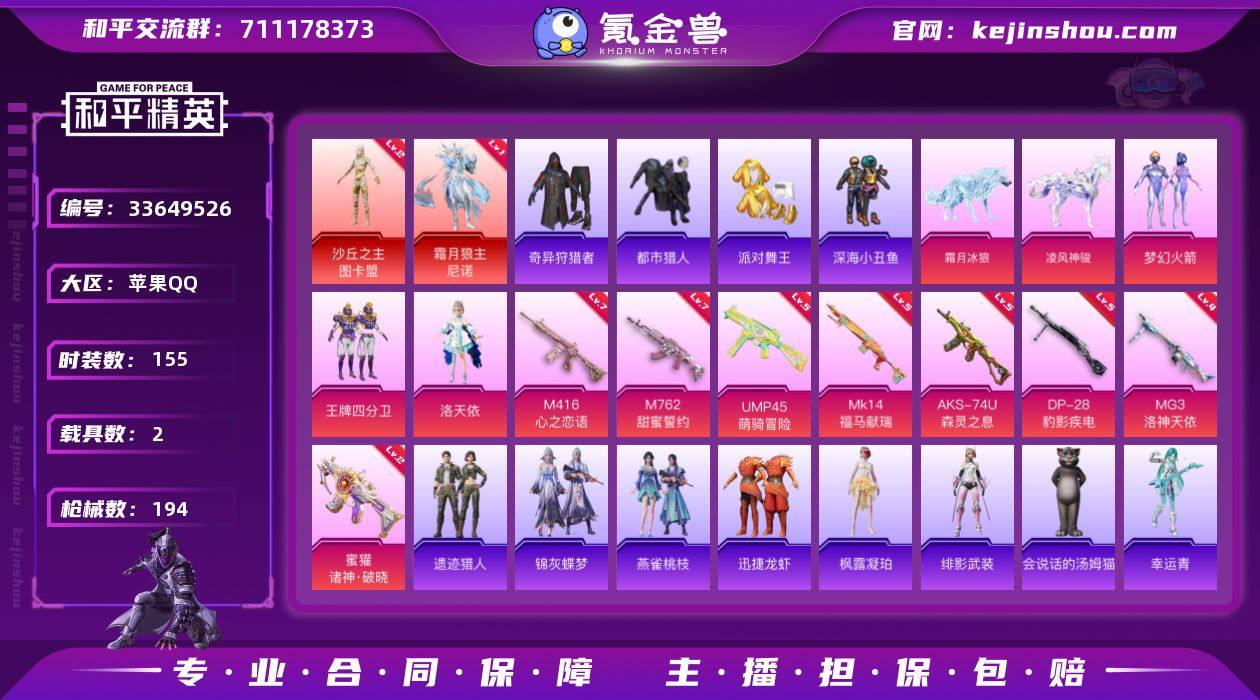 【kyhp2112】苹果 手Q-2神装-3粉装-8特效枪-2载具-6粉色飞行器-63618热力值-9王牌印记-155套装-194枪皮 【红色神装等级】:霜月狼主-尼诺(一级),沙丘之主-图卡盟(二级) 【红色角色神装】:霜月狼主-尼诺,沙丘之主-图卡盟 【热门品类】:粉装-梦幻火箭,套装-浪漫天命,套装-都市猎人,套装-派对舞王,套装-深海小丑鱼,套装-奇异狩猎者,套装-金羽特工,套装-粉红小猪 【粉色套装】:粉装-梦幻火箭,粉装-王牌四分卫,角色-洛天依 【粉色枪皮等级】:M416-心之恋语(七级),M762-甜蜜誓约(七级),UMP45-萌骑冒险(五级),蜜獾-诸神·破晓(二级),AKS-74U-森灵之息(五级),Mk14-福马献瑞(五级),DP-28-豹影疾电(五级),MG3-洛神天依(四级) 【粉色载具】:凌风神骏,霜月冰狼 【粉色枪皮】:M416-心之恋语,M762-甜蜜誓约,蜜獾-诸神·破晓,UMP45-萌骑冒险,AKS-74U-森灵之息,Mk14-福马献瑞,DP-28-豹影疾电,MG3-洛神天依 【粉色飞行器】:香车宝马飞行器,梦幻火箭飞行器,精灵菇菇飞行器,踏卷乘风飞行器,纱华羽翼飞行器 【粉色降落伞】:极限特训降落伞,甜蜜誓约降落伞,四圣焕新降落伞,洛神天依降落伞,天马神君降落伞,鸢尾珑雾降落伞 【稀有套装】:角色-幸运青,角色...