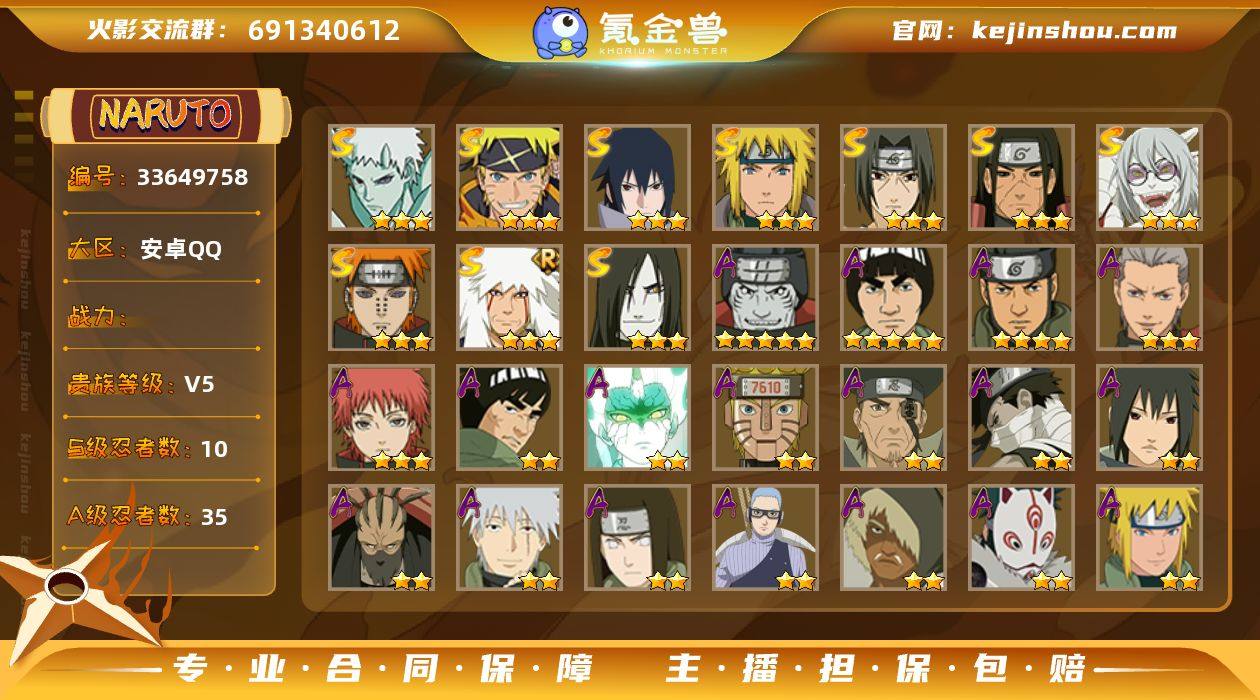 【XY394】VIP等级V5/S忍数量10/A忍数量35/二星A-日向宁次·忍界大战/二星A-我爱罗「疾风传」/三星S-宇智波带土「十尾人柱力」/二星A-达鲁伊「五代目雷影」/二星A-飞段「死司凭血」/二星A-宇智波鼬/三星S-宇智波佐助「永恒万花筒」/2星小南「神驹佑将」/三星A-飞段/三星S-佩恩「天道」/三星S-漩涡鸣人·宇智波佐助/二星A-照美冥「五代目水影」/三星S-波风水门/三星A-蝎/二星A-秋道丁次「忍界大战」/五星A-迈特凯/三星S-千手柱间「秽土转生」/二星A-土台「忍界大战」/二星A-神秘面具男 「忍者之路」/2星旗木卡卡西「神威对决」/三星S-药师兜「仙人模式」/二星A-长十郎「六代目水影」/二星A-波风水门 「青年」/二星A-蝎「绯流琥」/四星A-猿飞阿斯玛/三星S-自来也「舞之豪杰」/二星A-桃地再不斩「秽土转生」/二星A-黑土「四代目土影」/二星A-角都「晓创生」/二星A-迪达拉「秽土转生」/二星A-奇拉比/二星A-宇智波佐助「万花筒写轮眼」/二星A-宇智波泉奈/二星A-迪达拉/二星A-旗木卡卡西 「幻之真容」/二星A-巳月「仙人模式」/三星S-大蛇丸/二星A-漩涡鸣人「九尾查克拉」/二星A-迈特凯「青春爆炸」/二星A-宇智波佐助「须佐能乎」/五星A-干柿鬼鲛/二星A-机械鸣人「初始形态」/二星A-千代...