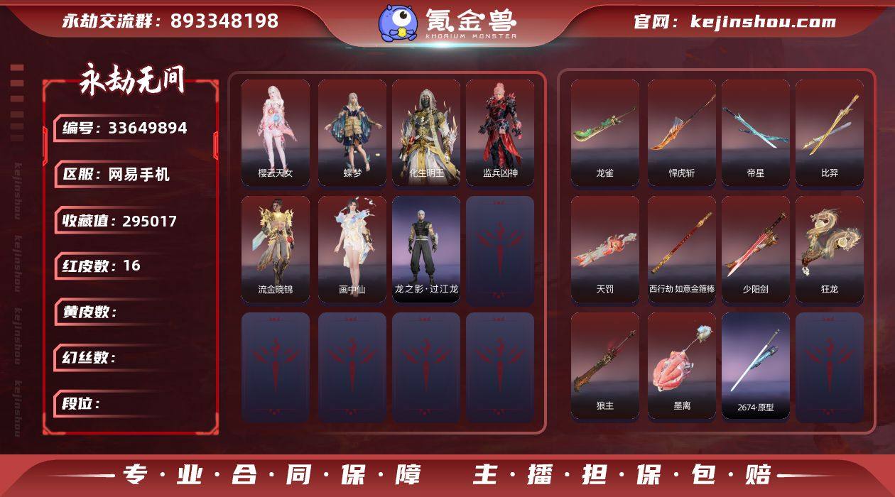 YJJ2384/5.14换绑/等级299/s20三人白银1/16红408金收藏值295017/墨离/化生明王/樱云天女/蝶梦/监兵凶神/流金晓锦/画中仙/天罚/少阳剑/帝星/比羿/龙雀/狼主/悍虎斩/西行劫·如意金箍棒/狂龙/2674·原型/绿野守护·竹韵悠/龙之影·过江龙/荆魂/幻丝190165/已绑定手游
