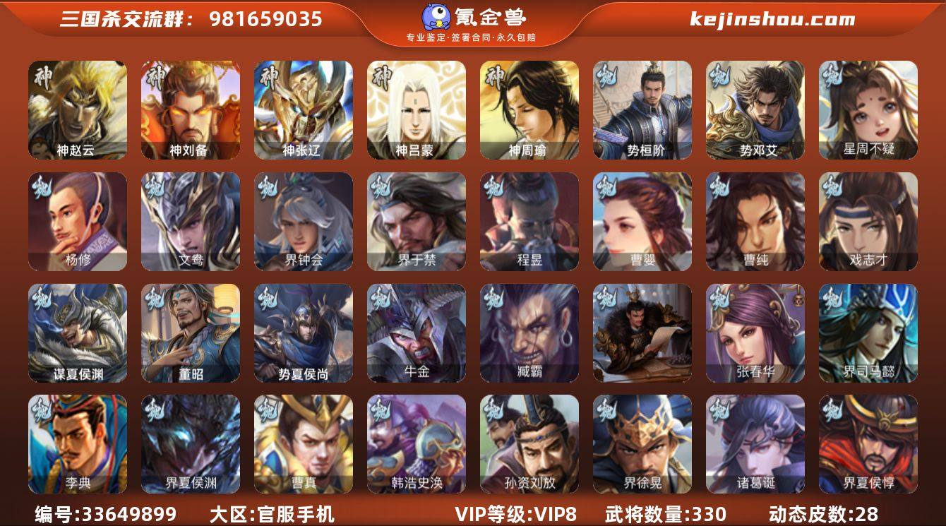 【14790260】官阶:骠骑将军;VIP等级:VIP8;史诗武将数量:28;动态皮肤数量:28;武将总数:330;史诗宝珠数量:57;将魂数量:1691;神将:3;魏国史诗武将:10;蜀国史诗武将:3;吴国史诗武将:8;群史诗武将:5
