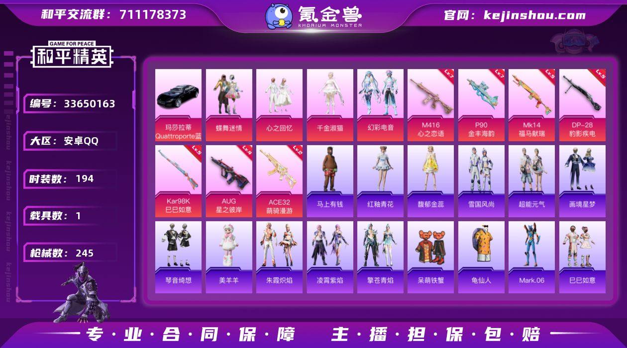 安卓 手Q-4粉装-7特效枪-1载具-3粉色飞行器-76511热力值-20王牌印记-194套装-245枪皮三角洲有个红皮小麦 王者有两个典藏 【热门品类】:套装-龟仙人,角色-Mark.06 【粉色套装】:粉装-蝶舞迷情,粉装-心之回忆,角色-千金淑猫,粉装-幻彩电音 【粉色枪皮等级】:M416-心之恋语(七级),AUG-星之彼岸(四级),ACE32-萌骑漫游(二级),P90-金丰海韵(七级),Kar98K-巳巳如意(五级),Mk14-福马献瑞(五级),DP-28-豹影疾电(五级) 【粉色载具】:玛莎拉蒂Quattroporte(夜幕蓝) 【粉色枪皮】:M416-心之恋语,AUG-星之彼岸,ACE32-萌骑漫游,P90-金丰海韵,Kar98K-巳巳如意,Mk14-福马献瑞,DP-28-豹影疾电 【粉色飞行器】:炫彩糖果飞行器,纯梦嫁纱飞行翼,萌物绒绒飞行器 【粉色降落伞】:暗夜玫瑰降落伞,碧影闪光降落伞,垂柳戏鸭降落伞,桃夭倾城降落伞,炫光之旅降落伞,祥瑞锦鲤降落伞,金丰海韵降落伞,千金淑猫降落伞,鬼刀降落伞,星穹咏叹调降落伞,异瞳寒姬降落伞,极意拳锋降落伞,罪夜之冕降落伞 【稀有套装】:套装-龟仙人,套装-巳巳如意,套装-超能元气,套装-雪国风尚,套装-马上有钱,套装-雏菊兔兔,套装-萝兰蝴蝶,角色-都市丽猫,角色-摩登魅猫,套装-燕燕于...
