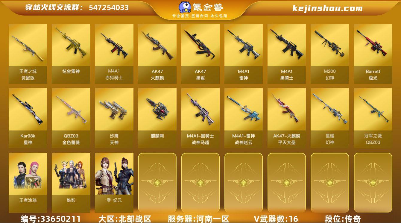河南一区-18V-4王者武器数-1炫金武器数 【热门武器】:QBZ03-金色蔷薇,M200-幻神,Kar98K-星神,M4A1-黑骑士 【王者炫金武器】:王者之魄高爆手雷*2,王者之魄闪光弹,炫金雷神 【音效卡】:Kar98K-星神音效卡,M4A1-黑骑士音效卡,Barrett-碧霄极光音效卡 【皮肤】:幻神-星耀 皮肤,QBZ03-冠军之薇,M4A1-战神赵云,火麒麟-平天大圣,黑骑士-战神马超 【角色】:魅影,零·纪元,王者涂鸦,斗烈龙骑,风暴女,娟娟,樱-战斗天使,团团 【人偶武器】:白虎-迷你小艾,生化手雷-机甲核心 【暴走生化】:黑龙吞噬者 【挑战大师】:AK47-冰龙粉碎者 【英雄级武器】:AK47-火麒麟,M4A1-雷神,M4A1-黑骑士,AK47-黑鲨,QBZ03-金色蔷薇,王者之城-觉醒版,天罚-斗烈龙驹,Barrett-极光,M200-幻神,Kar98K-星神,沙鹰-天神*4,麒麟刺,屠龙-斗烈龙驹,M4A1-赤狱骑士 【其他武器】:源·火麒麟,源·雷神,魂·雷神-诺拉,御·雷神-烈虎,M4A1-十二生肖·龙-雷神,魂·黑骑士-现代金属,魂·黑骑士-幻能朋克*2,魂·黑骑士-破浪10年,灵·黑骑士-破界 I,魂-死神-机甲核心,源·武圣*2,源·机械迷城,魂·龙血-锋芒破茧,魂·HK417-朱雀-凤灵*2,源·HK417-朱雀,魂·英雄-湾区光枢,魂·炼狱-玩具...