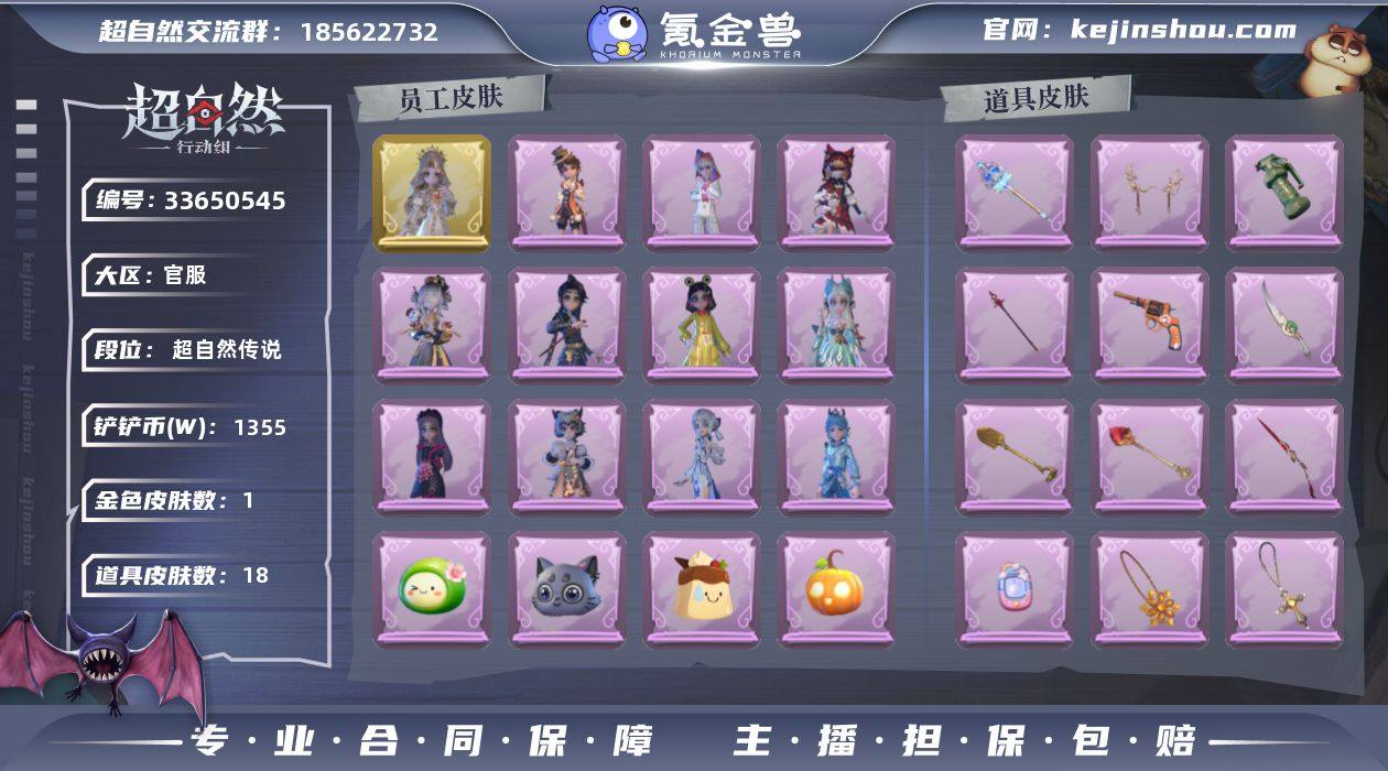 金皮1;紫皮11;道具皮18;皮肤:薇薇安-圣光之谕,艾伦-水王子,莉莉-除妖小师妹,爱丽丝-瑞羽衔春,小黄-呱呱雨衣,逍遥-绣春逍影,巫铃儿-素影瑶光,小黄-霓裳踏雪,阿念-庆宴绮愿,爱丽丝-丝缕哀歌,艾伦-绒绒对决,莉莉-莓果陷阱;道具:喷气背包-乘风溯雪,腰包-宝剑八,铲子-圣心之泪,刺刀-碧络琅环,传送按钮-幻宠之门,长枪-罪棘,转轮手枪-新星时代,黄牛能量饮料-珍珠芭乐莓莓,夜视仪-敛花容,摸金符-祝祷词,电击枪-权杖的许诺,摸金符-花落精绝,桃木剑-凤鸣九天,急救包-蔷薇物语,闪光弹-金戈玄铜,短管猎枪-赞萌露比水枪,音响-鸣沙鼓,铲子-龙鳞;饰品:头饰-烈焰红唇头套,头饰-樱桃奶油布丁,头饰-精致露比头套,头饰-滑稽头套,头饰-小财神豚豚头套,头饰-呆滞头套,头饰-面具马头套,头饰-哈士奇头套,头饰-炙热烧烤,头饰-鱼头怪头套,头饰-嘻嘻头套,头饰-驼半仙头套,头饰-卑微头套,头饰-萨卡班甲鱼头套,头饰-咬咬鲨头套,头饰-煤球喵头套,头饰-大葱明头套,头饰-青团糯糯,头饰-惊魂南瓜头套,头饰-火爆了头套,头饰-像素朋克墨镜,头饰-后室幸存者头套,挂饰-不朽的今夜,挂饰-九色祥鹿,挂饰-春信香囊,挂饰-钗头凤,挂饰-天使消失的年代,挂饰-未竟乐园,背饰-天使的呼唤,背饰-牛啤背包,背饰-放青松;...