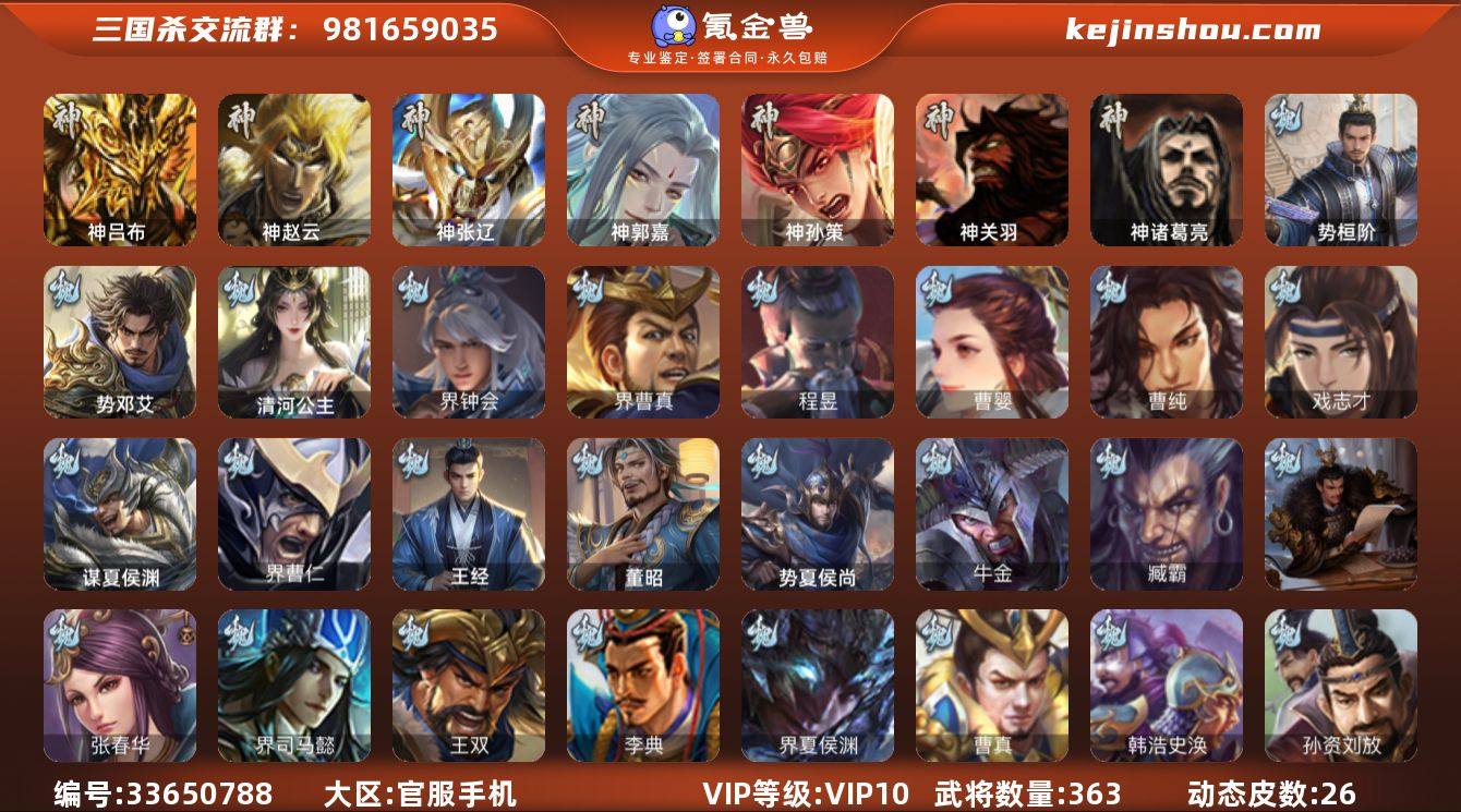 神吕布,神赵云,神张辽,神郭嘉,神孙策,神诸葛亮,界钟会,界曹真,曹婴,曹纯,戏志才,清河公主,程昱,势邓艾,势桓阶,关索,谋赵云,谋马超,谯周,花鬘,势魏延,周处,骆统,留赞,界朱然,界徐盛,势陆郁生,裴秀,界沮授,左慈,星黄忠,审配,沮授,界左慈,界李儒,公孙康,势于吉,友诸葛亮,星董卓,兀突骨,神关羽,势夏侯尚,SP关羽,SP曹仁,SP蔡文姬,乐进,曹昂,诸葛诞,朱灵,文聘,SP姜维,张春华,钟会,曹冲,郭淮,满宠,界王异,界曹操,界司马懿,界夏侯惇,界张辽,界许褚,界郭嘉,李典,曹真,韩浩史涣,陈群,曹叡,曹休,钟繇,司马朗,王基,郭皇后,孙资刘放,辛宪英,鲁芝,界荀彧,界徐晃,杜畿,界曹丕,界邓艾,张恭,贾逵,界曹植,界满宠,界郭淮,华歆,蔡贞姬,袁涣,王双,崔琰,阮慧,谋徐晃,谋于禁,界曹休,王经,谋夏侯渊,牛金,界夏侯渊,界曹仁,臧霸,唐咨,董昭,势陈到,SP孙尚香,关银屏,夏侯霸,马良,关兴张苞,廖化,界马岱,关平,简雍,刘封,界法正,界关兴张苞,界刘备,界关羽,界张飞,界赵云,界马超,SP徐庶,吴懿,周仓,张松,刘...