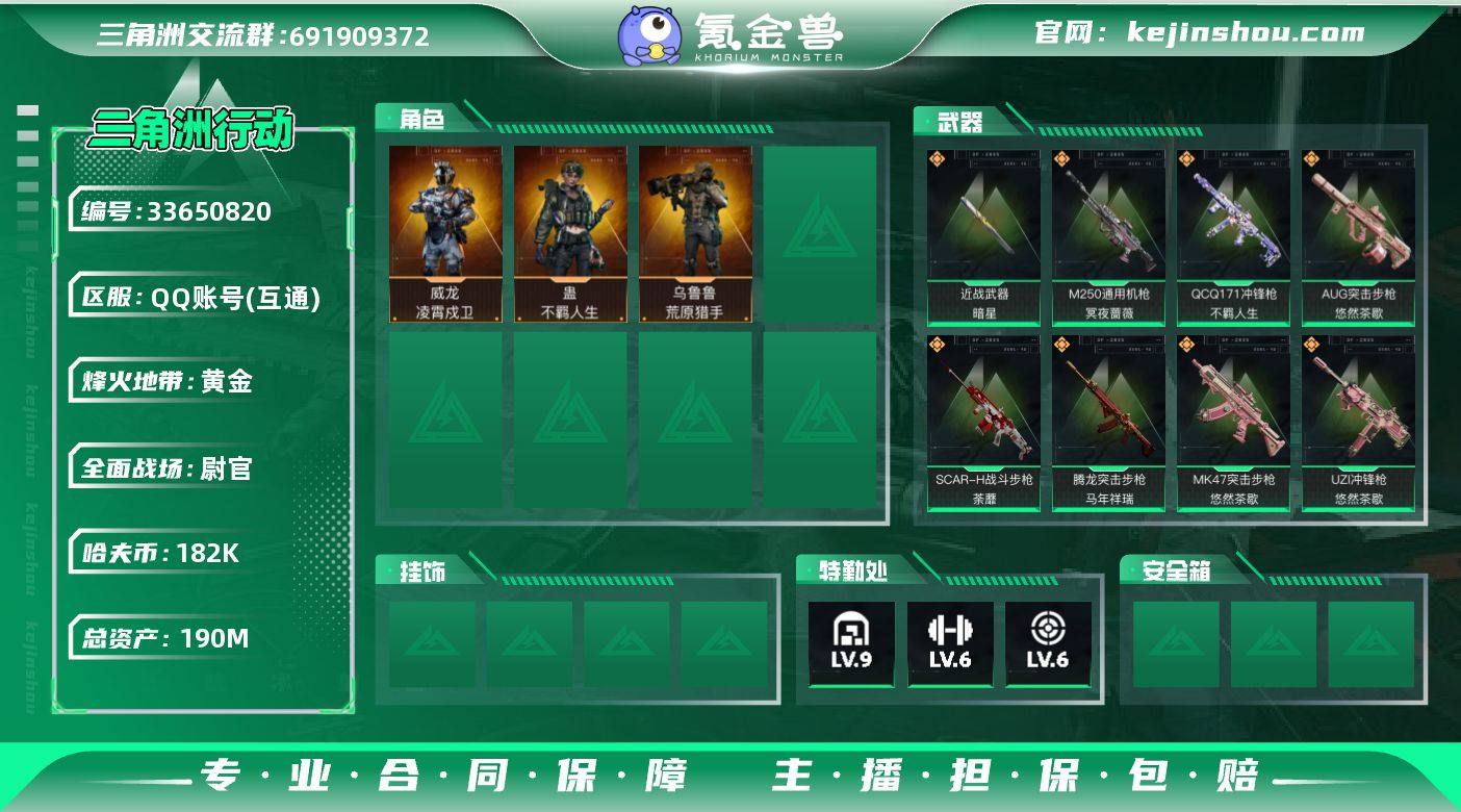 【热门搭配:单红+单刀暗星-凌霄戍卫.总资产190M】【Q区三端互通】【无二次协助处理】YXz9829-特勤处:仓库9级/靶场6级/训练中心6级-190m总资产-18w哈夫币-60烽火等级-黄金-37战场等级-尉官 【干员外观】:威龙-凌霄戍卫,乌鲁鲁-荒原猎手,蛊-不羁人生 【近战皮肤】:近战-暗星,近战-处刑者4级,近战-黑鹰 【传说外观】:M4A1突击步枪-阿米娅,QBZ95-1突击步枪-凌霄戍卫,M16A4突击步枪-狩猎时刻,AUG突击步枪-悠然茶歇,SCAR-H战斗步枪-启航,SCAR-H战斗步枪-荼蘼,G3战斗步枪-狩猎时刻,腾龙突击步枪-马年祥瑞,MK47突击步枪-悠然茶歇,MK47突击步枪-暗星,Vector冲锋枪-狩猎时刻,Vector冲锋枪-能天使-午夜邮差,UZI冲锋枪-悠然茶歇,SR-3M紧凑突击步枪-暗星,SR-3M紧凑突击步枪-荼蘼,勇士冲锋枪-能天使-午夜邮差,QCQ171冲锋枪-不羁人生,PKM通用机枪-荼蘼,M250通用机枪-冥夜蔷薇,M14射手步枪-蛮荒,M14射手步枪-缄花,SR-25射手步枪-缄花,AWM狙击步枪-万金泪冠,.357左轮-缄花,G18-马年祥瑞 【史诗外观】:KC17突击步枪-碎冰行动,腾龙突击步枪-檀劫铳影*2,AKM突击步枪-林中猎手,K416突击步枪-腊梅,K416突击步枪-阿萨拉特攻,AUG突击步枪-蝮蛇,SG552突击步枪-...