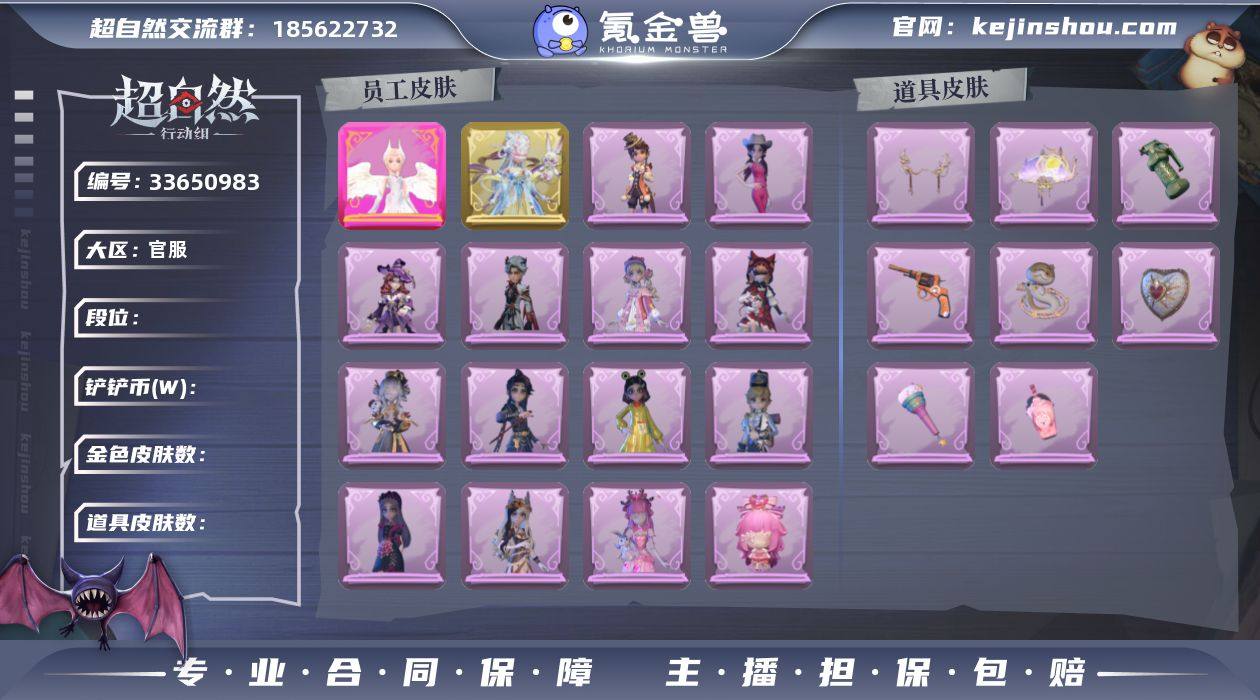粉皮1;金皮1;紫皮13;道具皮23;皮肤:小黄-炽天使,莉莉-瑶台梦,爱丽丝-甜梦派对,艾伦-黎明猎手,阿念-王子与骑士,莉莉-莓果陷阱,阿念-庆宴绮愿,小黄-呱呱雨衣,薇薇安-白光莹,爱丽丝-耀眼的你,逍遥-绣春逍影,兰-千夜星谕,莉莉-情公主,爱丽丝-丝缕哀歌,莉莉-除妖小师妹;道具:夜视仪-敛花容,转轮手枪-新星时代,闪光弹-金戈玄铜,长鞭-小狗蛇点点鞭,黄牛能量饮料-珍珠芭乐莓莓,腰包-宝剑八,专业手电-云端梦想计划,折扇-赴此良宵,短管猎枪-星光的裁决,传送按钮-浮生一梦,喷气背包-乘风溯雪,长鞭-缚誓之锁,摸金符-紫霄,急救包-蔷薇物语,音响-happy猫,长枪-罪棘,传送按钮-逆时审判,额外的背包-灵感泉之花,摸金符-花落精绝,摸金符-海洋之心,音响-鸣沙鼓,桃木剑-绯色遗证,刺刀-碧络琅环;美妆:美妆-暗夜小恶魔;饰品:头饰-呆滞头套,头饰-太空鲨头套,头饰-惊魂南瓜头套,头饰-嘻嘻头套,头饰-火爆了头套,头饰-鱼头怪头套,头饰-萨卡班甲鱼头套,头饰-卑微头套,头饰-大葱明头套,头饰-樱桃奶油布丁,头饰-驼半仙头套,头饰-烈焰红唇头套,头饰-烛光纪念,头饰-蒜了八,头饰-面具马头套,头饰-哈士奇头套,头饰-滑稽头套,头饰-马上有钱,头饰-炙热烧烤,头饰-芝麻糊汤圆,头饰-雪墩墩头套,头饰-像素...