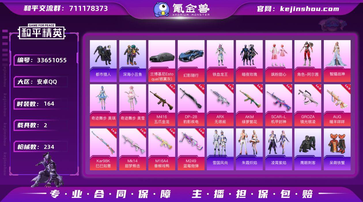 【kyhp82】安卓 手Q-7粉装-11特效枪-2载具-1粉色飞行器-75713热力值-10王牌印记-164套装-234枪皮 【热门品类】:套装-都市猎人,套装-深海小丑鱼,角色-军刀雅典娜,套装-龟仙人,套装-暗影哥特,角色-Mark.06 【粉色套装】:粉装-铁血龙王,粉装-暗夜玫瑰,粉装-飒粉甜心,角色-阿尔茜,角色-智耀战神,角色-奇迹舞步 美琪,角色-奇迹舞步 美雪 【粉色枪皮等级】:AKM-绿萝繁花(五级),M16A4-垂柳戏鸭(四级),SCAR-L-机甲封神(五级),M416-五爪金龙(七级),GROZA-镜光银凌(五级),AUG-暖羊咩咩(五级),ARX-无垠阁(五级),Kar98K-巳巳如意(五级),Mk14-甜梦熊击(五级),M249-蓝莓炮弹(四级),DP-28-豹影疾电(五级) 【粉色载具】:兰博基尼Estoque(银翼灰),幻影随行 【粉色枪皮】:AKM-绿萝繁花,M16A4-垂柳戏鸭,SCAR-L-机甲封神,M416-五爪金龙,GROZA-镜光银凌,AUG-暖羊咩咩,ARX-无垠阁,Kar98K-巳巳如意,Mk14-甜梦熊击,M249-蓝莓炮弹,DP-28-豹影疾电 【粉色降落伞】:烈焰拳霸降落伞,暗夜玫瑰降落伞,洛神天依降落伞,庄周梦蝶降落伞,垂柳戏鸭降落伞,旋转彩虹降落伞,青空秋雨降落伞,第五大道降落伞,未来歌姬降落伞,炫光之旅降落伞,精灵梦叶罗丽降落伞,星...