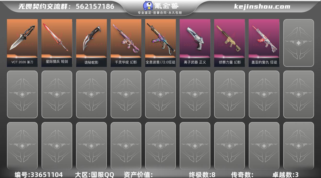 【LX64036 追封包赔+包人脸】【29英雄43皮肤】【8传奇武器3卓越】 【套装】:VCT 2026 赛季套装 【英雄】:幻棱,炼狱,维斯,暮蝶,钛狐,壹决,铁臂,捷风,雷兹,幽影,不死鸟,贤者,猎枭,蝰蛇,零,芮娜,奇乐,尚勃勒,霓虹,斯凯,夜露,星礈,K/O,海神,盖可,黑梦,钢锁 【近战武器】:近战武器-VCT 2026 篆刀,近战武器-镭切,近战武器-影刃,近战武器-诡秘蛇影 军刀,近战武器-星际猎兵 短剑 【狂徒】:狂徒-全息波普//2.0,狂徒-荆刺圣骸,狂徒-盖亚的复仇,狂徒-诡秘蛇影 【幻影】:幻影-千灵华绽,幻影-侦察力量,幻影-末日之翼 【戍卫】:戍卫-折光棱晶 【飞将】:飞将-末日之翼 【莽侠】:莽侠-诡秘蛇影 【奥丁】:奥丁-末日之翼 【判官】:判官-诡秘蛇影 【骇灵】:骇灵-无限竞技 【蜂刺】:蜂刺-折光棱晶 【标配】:标配-折光棱晶 【正义】:正义-离子武器,正义-超限闪存,正义-纳米打击,正义-游戏结束 【鬼魅】:鬼魅-诡秘蛇影 【狂怒】:狂怒-蒙太奇 【短炮】:短炮-好搭档,短炮-末日之翼 【卡面】:终章:激斗汉堡 卡面,进入射程 卡面,《双城之战》拥抱 卡面,精灵大战 卡面,欢迎来到底城 卡面,南瓜盛典 卡面,修车达人 卡...