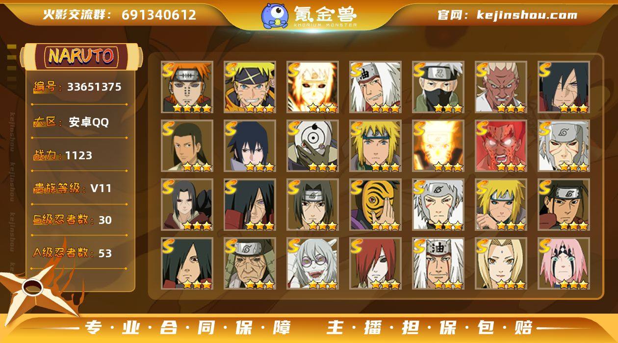 【HYC1864】VIP等级V11/战力1123W/S忍数量30/A忍数量53/三星S-宇智波斑「秽土转生」/二星A-波风水门「新春限定」/三星S-纲手/三星S-波风水门「九喇嘛连结」/二星A-达鲁伊「五代目雷影」/二星A-飞段「死司凭血」/二星A-宇智波止水/五星A-猿飞阿斯玛/三星S-旗木卡卡西「须佐能乎」/2星小南「神驹佑将」/三星S-宇智波斑/三星S-猿飞日斩「秽土转生」/二星A-照美冥「五代目水影」/三星S-千手扉间/二星A-猿飞阿斯玛「秽土转生」/五星A-迈特凯/二星A-宇智波鼬「新春限定」/三星S-自来也/二星A-奇拉比「忍界大战」/三星S-千手扉间「秽土转生」/三星S-千手柱间·木叶创立/三星S-药师兜「仙人模式」/二星A-长十郎「六代目水影」/三星A-蝎「绯流琥」/二星A-桃地再不斩「秽土转生」/二星A-春野樱「百豪」/三星S-宇智波斑「白面具」/三星S-迈特凯「死门」/三星S-自来也 「传说中的三忍」/三星S-千手柱间/二星A-黑土「四代目土影」/二星A-勘九郎「忍界大战」/二星A-迪达拉「秽土转生」/二星A-药师兜「半蛇斗篷」/三星S-春野樱 「忍界大战」/二星A-宇智波佐助「万花筒写轮眼」/二星A-我爱罗「忍界大战」/二星A-迪达拉/四星A-我爱罗「疾风传」/二星A-漩涡鸣人「九尾查克拉」/二星A-猿飞木叶丸「...