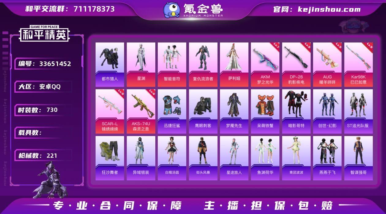 【特价出售】钱包不能注销安卓Q-2稀有4粉装11特效枪18热门191套装221枪皮 66937热力值 16印记 历史无敌战神 【2稀有】 M416-星际漫游 都市猎人 【4粉装】 萨利娅 星渊 智能音符 复仇流浪者 【11特效枪】 SCAR-L-锦绣绵绵 (5级) AKS-74U-森灵之息 (4级) Kar98K-巳巳如意 (5级) DP-28-豹影疾电 (5级) AUG-暖羊咩咩 (5级) AKM-梦之光华 (7级) Mk14-福马献瑞 (5级) ACE32-萌骑漫游 (3级) 燃烧瓶-天降桃花 (4级) 破片手榴弹-招财进宝 (6级) 烟雾弹-好运连连 (3级) 【18热门】 Mark.06 龟仙人 暗夜之虎 梦魇先生 呆萌铁蟹 鹰眼刺客 暗夜之虎 迅捷狂鲨 ST追光队服 暗影哥特 团圆交子 瑞龙福将 狂沙舞者 漫步者 破蛋小黄鸡 英勇保护者 弄潮海豚 M762-瑞龙福将 【2头盔】 银河战甲头盔 深海小丑鱼头盔 【1背包】 萌熊伴侣背包