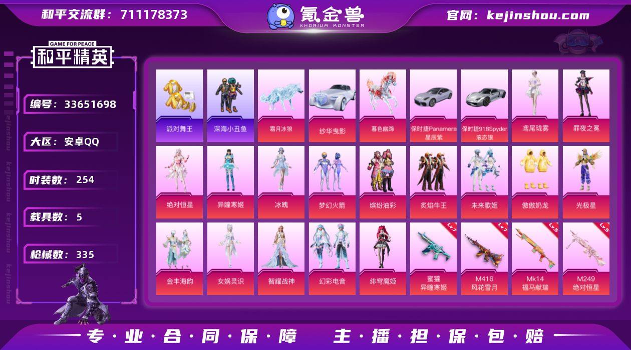 安卓【素材号/20王牌印记/梦幻火箭/缤纷油彩/派对舞王/暗影哥特/16粉装-13特效枪-5载具-14粉色飞行器】 手Q-116489热力值-20王牌印记-254套装-335枪皮 【热门品类】:粉装-梦幻火箭,粉装-缤纷油彩,套装-浪漫天命,套装-派对舞王,套装-深海小丑鱼,套装-金羽特工,套装-龟仙人,套装-暗影哥特 【粉色套装】:角色-绝对恒星,粉装-梦幻火箭,粉装-缤纷油彩,粉装-炙焰牛王,粉装-未来歌姬,粉装-傲傲奶龙,角色-光极星,粉装-金丰海韵,角色-女娲灵识,角色-智耀战神,粉装-幻彩电音,角色-绯穹魔姬,角色-冰魄,角色-异瞳寒姬,角色-罪夜之冕,角色-鸢尾珑雾 【粉色枪皮等级】:M416-风花雪月(七级),M416-灵猫魔法师(三级),GROZA-镜光银凌(五级),AUG-花中眠(四级),蜜獾-异瞳寒姬(七级),Vector-最终圣卫者(三级),P90-魔童闹海 敖丙(三级),Kar98K-巳巳如意(五级),Mk14-福马献瑞(五级),M249-绝对恒星(五级),DP-28-豹影疾电(五级),DP-28-鸢尾珑雾(一级),MG-36-虹云熊熊(四级) 【粉色载具】:保时捷Panamera(星辰紫),保时捷918 Spyder(液态银),纱华曳影,暮色幽蹄,霜月冰狼 【粉色枪皮】:M416-风花雪月,M416-灵猫魔法师,GROZA-镜光银凌,AUG-花中眠,蜜獾-...