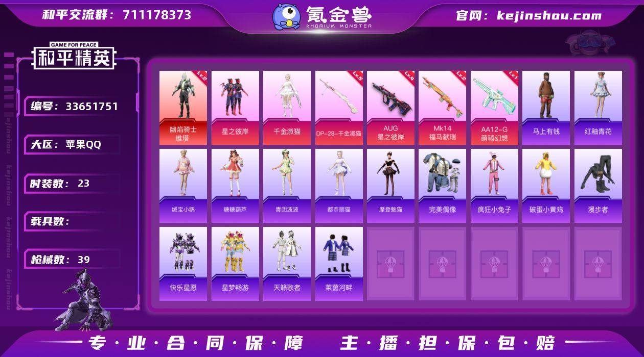 【LHPX1456】【特价出售/店主推荐】苹果 手Q-1神装-2粉装-4特效枪-2粉色飞行器-15655热力值-2王牌印记-23套装-39枪皮【红色神装等级】:幽焰骑士-维塔(二级)【粉色套装】:粉装-星之彼岸,角色-千金淑猫【粉色枪皮等级】:AUG-星之彼岸(四级),Mk14-福马献瑞(二级),AA12-G-萌骑幻想(一级),DP-28-千金淑猫(五级)【粉色飞行器】:幽焰列车飞行器,灵猫魔法师飞行器