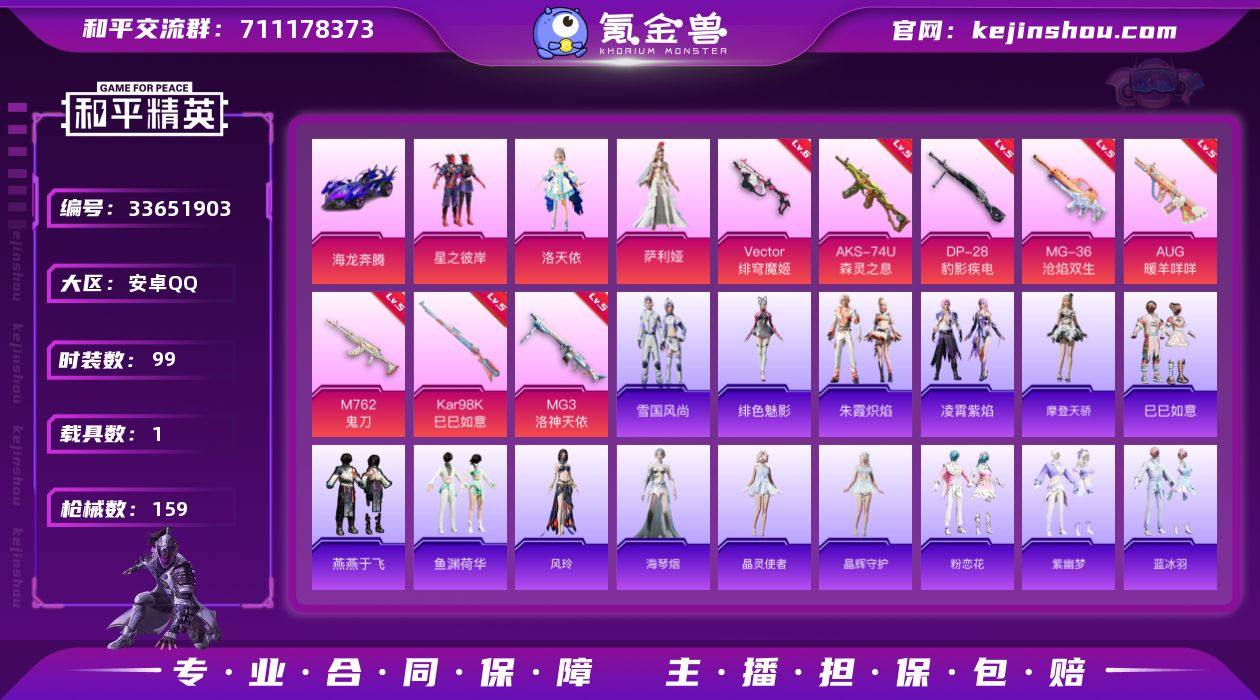 【kyhp142】安卓 手Q-3粉装-8特效枪-1载具-1粉色飞行器-45186热力值-10王牌印记-99套装-159枪皮 【粉色套装】:粉装-星之彼岸,角色-洛天依,角色-萨利娅 【粉色枪皮等级】:AUG-暖羊咩咩(五级),M762-鬼刀(五级),Vector-绯穹魔姬(六级),AKS-74U-森灵之息(五级),Kar98K-巳巳如意(五级),DP-28-豹影疾电(五级),MG3-洛神天依(五级),MG-36-沧焰双生(五级) 【粉色载具】:海龙奔腾 【粉色枪皮】:AUG-暖羊咩咩,M762-鬼刀,Vector-绯穹魔姬,AKS-74U-森灵之息,Kar98K-巳巳如意,DP-28-豹影疾电,MG3-洛神天依,MG-36-沧焰双生 【粉色降落伞】:洛神天依降落伞,第五大道降落伞,鬼刀降落伞,异瞳寒姬降落伞,炫彩糖果降落伞 【稀有套装】:套装-摩登天骄,套装-巳巳如意,套装-雪国风尚,套装-炫彩糖果,套装-燕燕于飞,套装-鱼渊荷华,角色-风玲,角色-海琴烟,套装-晶灵使者,套装-晶辉守护,套装-粉恋花,套装-紫幽梦,套装-蓝冰羽,套装-星影赞美诗,套装-彩虹兔,套装-云朵鹅,套装-雪绒豹,套装-朱霞炽焰,套装-凌霄紫焰,角色-绯色魅影 【稀有枪皮】:M79短管榴弹-钛晶裂爪,AUG-冰晶雪宝,AKM-彩虹符号,AKM-灼热熔岩,AKM-破晓战魂,M16A4-幻世战舞者,SCAR-L-夜灯...