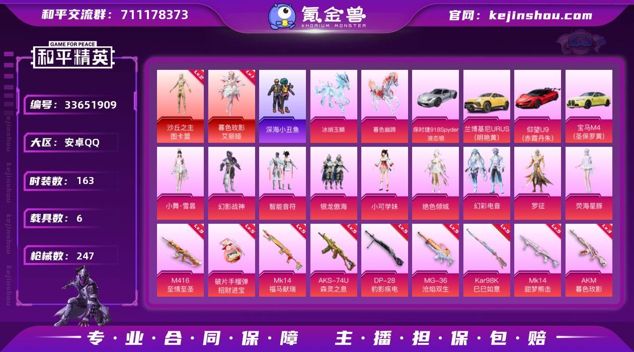 【LHPX1480】【特价出售/店主推荐】安卓 手Q-2神装-9粉装-10特效枪-6载具-14粉色飞行器-81194热力值-10王牌印记-163套装-247枪皮【红色神装等级】:暮色玫影-艾丽娅(一级),沙丘之主-图卡盟(二级)【热门品类】:套装-浪漫天命,套装-深海小丑鱼,套装-小丑鱼,角色-军刀雅典娜,套装-忍者信条,套装-龟仙人,熔岩游骑兵连帽夹克【粉色套装】:粉装-幻影战神,粉装-智能音符,粉装-银龙傲海,角色-小可学妹,角色-绝色倾城,粉装-幻彩电音,角色-罗征,角色-荧海星豚,人物-小舞·雪昙【粉色枪皮等级】:AKM-暮色玫影(三级),M416-至情至圣(九级),ACE32-萌骑漫游(二级),AKS-74U-森灵之息(五级),Kar98K-巳巳如意(五级),Mk14-甜梦熊击(五级),Mk14-福马献瑞(五级),DP-28-豹影疾电(五级),MG-36-沧焰双生(五级),破片手榴弹-招财进宝(五级)【粉色载具】:兰博基尼URUS(明艳黄),仰望U9(赤霞丹朱),宝马M4(圣保罗黄),保时捷918 Spyder(液态银),冰绡玉鳞,暮色幽蹄【粉色枪皮】:AKM-暮色玫影,M416-至情至圣,ACE32-萌骑漫游,AKS-74U-森灵之息,Kar98K-巳巳如意,Mk14-甜梦熊击,Mk14-福马献瑞,DP-28-豹影疾电,MG-36-沧焰双生,破片手榴弹-招财进宝【粉色飞行器】...