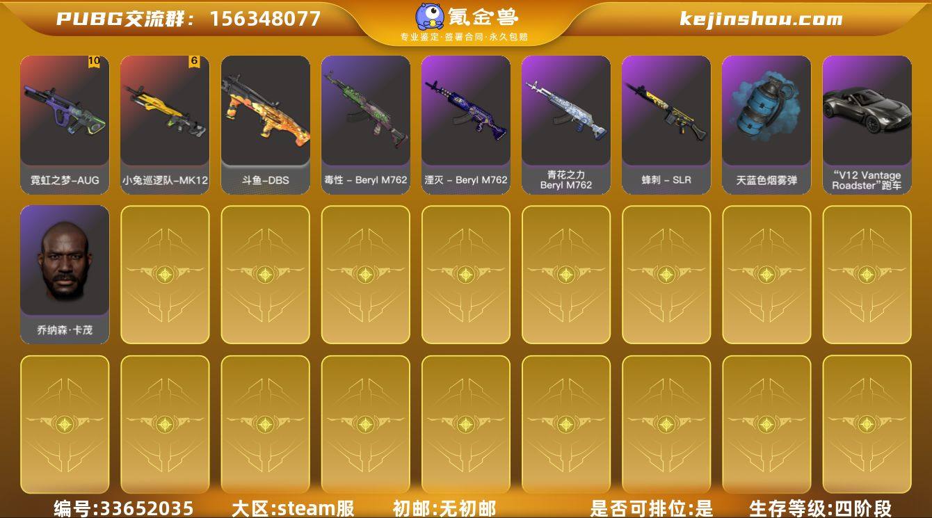 GJD13908 生存500级可排位/10级霓虹之梦-AUG/6级小兔巡逻队-MK12/1级时空使者-M416/阿斯顿马丁跑车/小兔巡逻队-MK12(紫色)/紫色魔法烟枪/天蓝色烟雾弹/粉色烟雾弹/红鞋/拉风龙-风华套装/拉风龙-勇往套装/红鞋/金面具/黑鬼/滑雪镜/太阳之子电池干扰背包/ 0BHGB5号 无排名, 生存等级1941, 名誉等级4, 金标数量1, 图纸1, 聚合物5692, 枪皮数量115, [成长型] 霓虹之梦 - AUG[10级], [成长型] 时空使者 - M416[1级], [成长型] 小兔巡逻队 - Mk12[6级], “V12 Vantage Roadster” 跑车