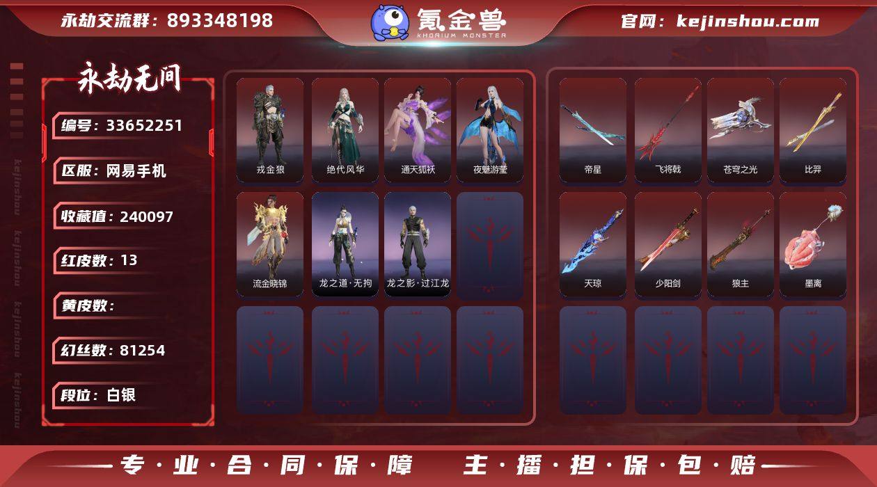 WJ6185,网易手机,可换绑,三人段位白银1,声望1,13红,334金,等级276,收藏值,幻丝81254,金砖240,通行证Lv1,变身器,噬骨,霜翎,龙门石龛造像,红色神品,墨离,绝代风华,夜魅游莹,通天狐袄,流金晓锦,戎金狼,苍穹之光,狼主,飞将戟,少阳剑,天琼,帝星,比羿,角色金色皮肤,封神录申公豹,司天命,朝闻道,禄运玉霄,紫微星命,赤丹朱湛,千秋匠心玉叶景,观山海青鸟,浣烟纱,瀚海苍鹰,福瑞天泽,葫芦兄弟蛤蟆头领,观山海秋神蓐收,西行劫悟空,干将莫邪,护世四法持国天王,绿野守护悠竹萌客,街头狂欢涂鸦少女,武道无穷咏春,绮云衫,西行劫紫衣仙子,观山海冬神玄冥,日影花阴,黄昏巫主,天工奥妙,夜绸袍,绿野守护山漠狞影,开辟鸿蒙日月明,雪铃绮歌,狩猎都市雷行猎手,武道无穷少林,智绘萍之缘,怪诞狂想友情岁月,斗罗大陆唐三,巫师3杰洛特,巨阙,游四海,夜华朝,碧水青天,九阴圣女,洛天依星空投影,长歌诗韵遣唐使,春桃笑,御宅罗梦,清雅少女,狩猎都市暗夜利刃,阴阳师赤影妖刀姬,妖刀姬,绿野守护暗沼摩罗,阿娜希塔,楚韵九歌湘夫人,龙之道无拘,怒浪,西行劫杨戬,弘毅袍,龙之影过江龙,