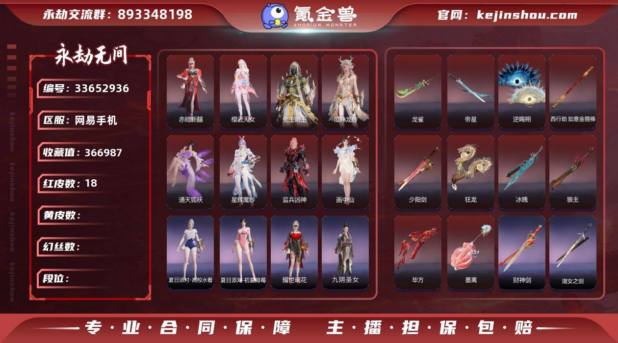 YJJ2389/365换绑/等级362/s20三人黄金2/19红572金收藏值366987/19红色神品:/赤皓新囍/星辉魔纱/化生明王/樱云天女/泣珠龙纱/监兵凶神/通天狐袄/画中仙/冰魄_/少阳剑/帝星/狼主/龙雀/如意金箍棒/逆晦朔/狂龙/毕方/墨离/【技能奥义】/珥冰/宝葫芦/勾玉/星熠/应龙号/御祥云/初代机/揽九天/三娃葫芦 【武技外观】/封两仪·煌/御足轮·赤 宁红夜:/赤皓新囍/山川润/倒反阴阳炽羽/昆仑之主/九阴圣女/耀世魂花/夜华朝/泠川发/簪缨发/落霜发 沈妙:/星辉魔纱/絮云衣/悠竹萌客/奥村春NOIR/初夏绯莓/娇憨发/NOIR发型 天海:/化生明王/伏龙尊者/白熊/悟净 殷紫萍:/萍之缘/福寿仙/鹅黄纱梦/风雨谐/瑶光沐月/暮落发/紫芙发/暖绒发 特木尔:/银狼裘/致命玩笑/友情岁月/街头梦语/唐三/路奇迷踪/红蓝狂想/追猎/海神发 季沧海:/不良人李星云/康复之星/巨阙/杰洛特/鹧鸪天/火男闻道/熛怒发/江海发/白狼发/含锋发/冲冠发 胡桃:/樱云天女/遣唐使/星空投影/小舞/高校水着/清雅少女/春桃笑/樱舞发/月丹发/雀变发 妖刀姬:/暗夜利刃/恋念私语/灼舞桃节/赤影妖刀姬 崔三娘:/泣珠龙纱/湘夫人/汐泪/阿娜希塔/暗沼摩罗/巨鲸客/鲸海发/冷傲发 岳山:/金戈止/铁面/戍关将/弘毅袍/破荆者/过江龙/玄鳞发 无尘:/黄庭道/...