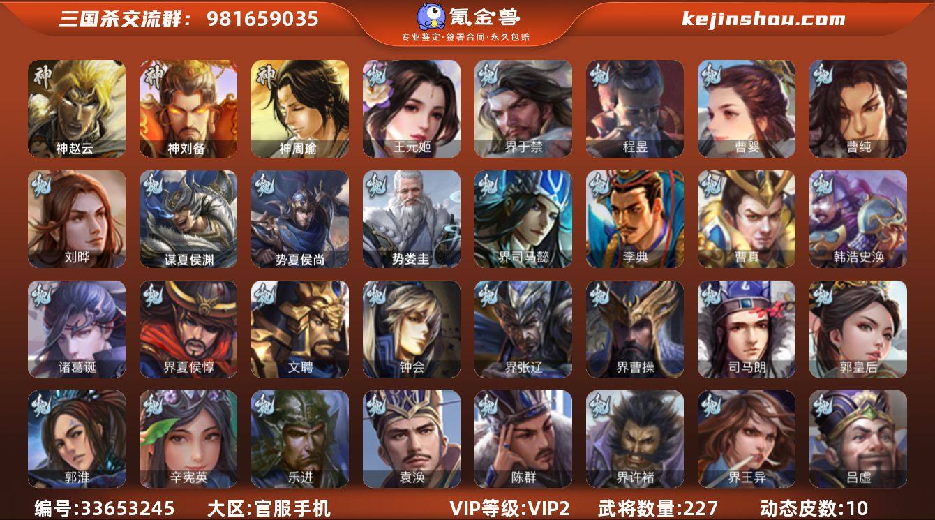 神赵云,神刘备,王元姬,界于禁,曹婴,曹纯,刘晔,程昱,谋马超,吴景,界朱然,界徐盛,左慈,星黄忠,界李儒,公孙康,神周瑜,势夏侯尚,SP关羽,SP蔡文姬,乐进,曹昂,诸葛诞,朱灵,文聘,SP姜维,钟会,曹冲,郭淮,满宠,界王异,界曹操,界司马懿,界夏侯惇,界张辽,界许褚,界郭嘉,李典,曹真,韩浩史涣,陈群,曹叡,曹休,钟繇,司马朗,郭皇后,辛宪英,吕虔,界荀彧,界满宠,袁涣,谋夏侯渊,SP孙尚香,关银屏,夏侯霸,马良,关兴张苞,廖化,界马岱,关平,简雍,刘封,界法正,界关兴张苞,界刘备,界关羽,界张飞,界赵云,界马超,SP徐庶,吴懿,周仓,张松,夏侯氏,李严,界诸葛亮,赵统赵广,界庞统,张翼,界简雍,费祎,糜夫人,向宠,彭羕,界张嶷,谋张飞,诸葛果,甘夫人,诸葛瑾,孙鲁育,程普,韩当,潘璋马忠,虞翻,朱然,界甘宁,界黄盖,界周瑜,界大乔,界陆逊,孙鲁班,朱桓,顾雍,孙休,界孙权,吕岱,孙邵,谋韩当,界孙休,界全琮,界朱治,张布,友庞统,伏完,刘协,界袁术,SP赵云,SP貂蝉,张宝,伏皇后,李儒,界张角,华雄,袁术,界华佗,界吕布,公孙瓒,蔡夫人,公...