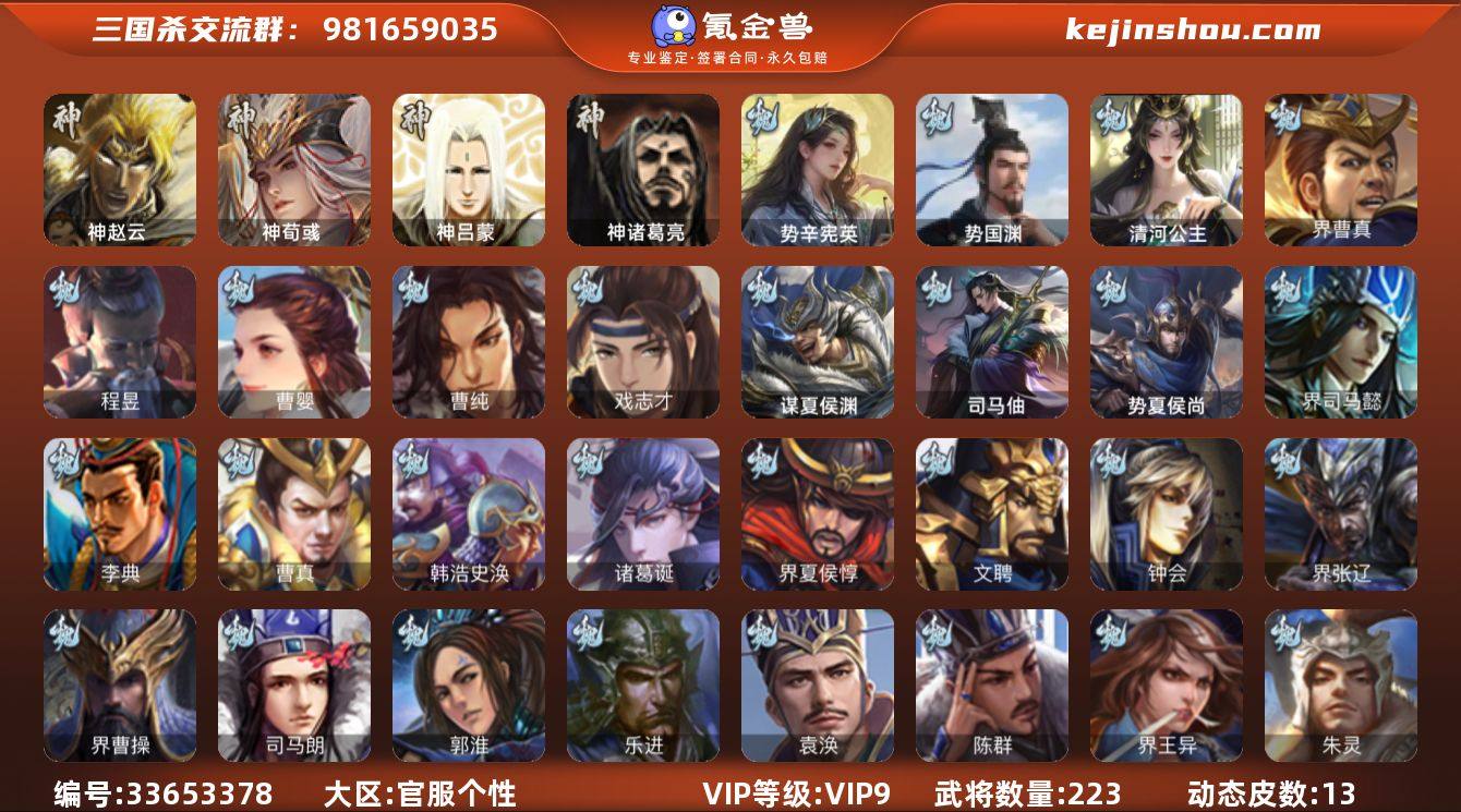 官阶:领军将军;VIP等级:VIP9;史诗武将数量:18;动态皮肤数量:13;武将总数:223;史诗宝珠数量:76;将魂数量:9032;神将:3;魏国史诗武将:8;蜀国史诗武将:2;吴国史诗武将:2;群史诗武将:5