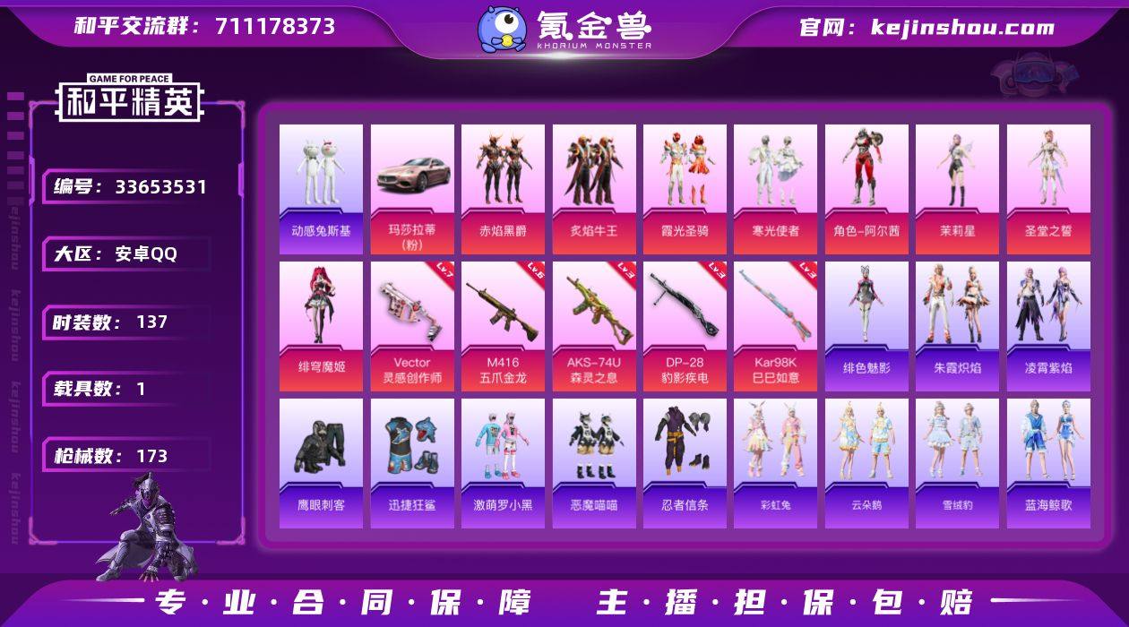【kyhp265】安卓 手Q-8粉装-5特效枪-1载具-3粉色飞行器-57699热力值-6王牌印记-137套装-173枪皮 【热门品类】:套装-忍者信条,套装-动感兔斯基人偶服 【粉色套装】:粉装-赤焰黑爵,粉装-炙焰牛王,粉装-霞光圣骑,粉装-寒光使者,角色-阿尔茜,角色-茉莉星,角色-圣堂之誓,角色-绯穹魔姬 【粉色枪皮等级】:M416-五爪金龙(六级),Vector-灵感创作师(七级),AKS-74U-森灵之息(三级),Kar98K-巳巳如意(三级),DP-28-豹影疾电(三级) 【粉色载具】:玛莎拉蒂Ghibli(粉) 【粉色枪皮】:M416-五爪金龙,Vector-灵感创作师,AKS-74U-森灵之息,Kar98K-巳巳如意,DP-28-豹影疾电 【粉色飞行器】:星夜魔法师飞行翼,沙丘之主天马 【粉色降落伞】:橘柚倾心降落伞,冷魅冰骑降落伞,沙丘之主降落伞,猪猪侠降落伞,绯穹魔姬降落伞,炫彩糖果降落伞 【稀有套装】:套装-炫彩糖果,套装-彩虹兔,套装-云朵鹅,套装-雪绒豹,套装-蓝海鲸歌,角色-绛羽幽主,套装-朱霞炽焰,套装-凌霄紫焰,角色-绯色魅影 【稀有枪皮】:AUG-冰晶雪宝,AKM-彩虹符号,AKM-影袭,AKM-春暖花开,AKM-灼热熔岩,AKM-王牌投手,AKM-破晓战魂,AKM-虎虎生威,AKM-霓虹街区,AKM-龙的传人,M16A4-凝视深渊,M...