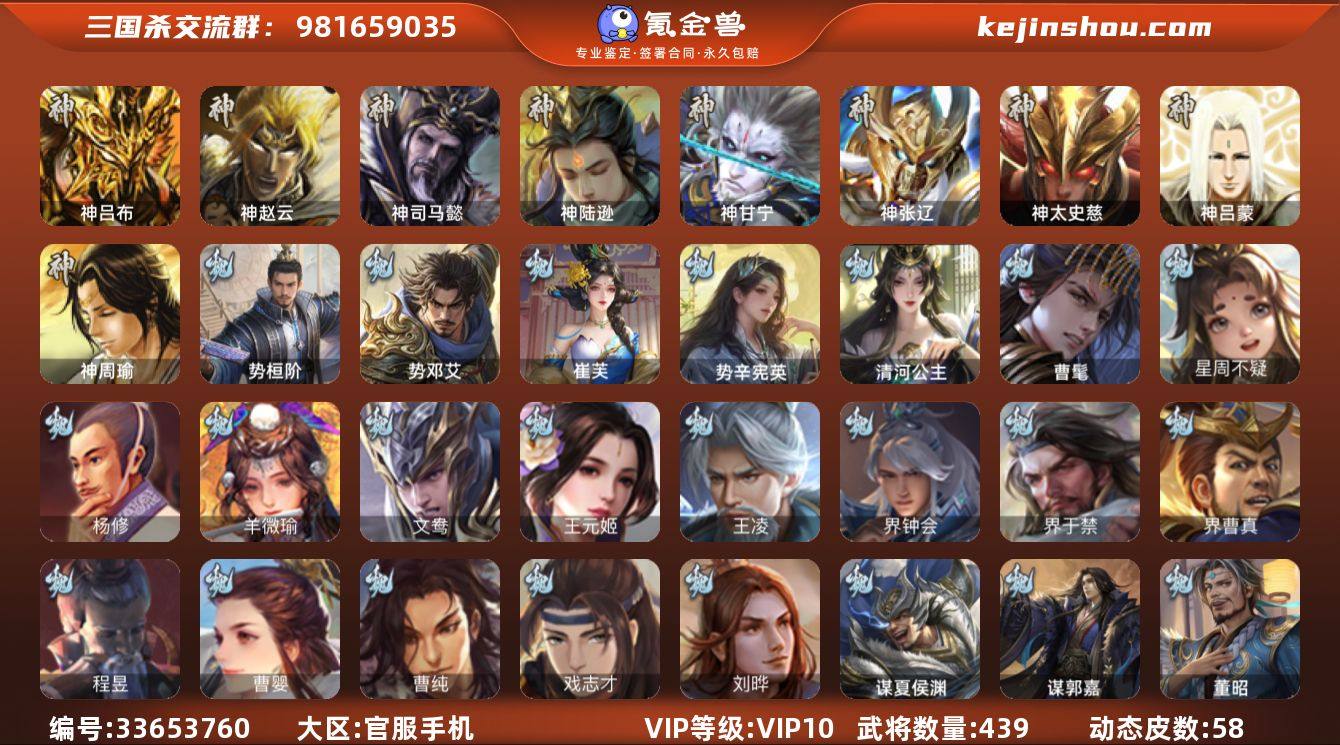 神吕布,神赵云,神司马懿,神陆逊,神甘宁,神张辽,神太史慈,曹髦,星周不疑,杨修,羊徽瑜,王元姬,王凌,界钟会,界于禁,界曹真,曹婴,曹纯,戏志才,刘晔,清河公主,崔芙,势辛宪英,程昱,势邓艾,势桓阶,谋诸葛亮,马云騄,谋赵云,谋马超,诸葛瞻,周群,赵襄,张星彩,王平,沙摩柯,谯周,界黄忠,花鬘,董允,周处,吴景,孙皓,骆统,界朱然,界徐盛,界步练师,贺齐,势陆郁生,文鸯,谋孙尚香,谋朱然,左慈,张让,星甘宁,王允,苏飞,麹义,庞德公,南华老仙,沮授,界李儒,公孙康,陈登,卑弥呼,谋张角,许攸,谋吕布,星董卓,兀突骨,司马昭,神吕蒙,神周瑜,势夏侯尚,SP关羽,SP曹仁,SP蔡文姬,乐进,曹昂,诸葛诞,朱灵,文聘,SP姜维,张春华,钟会,曹冲,郭淮,满宠,界王异,界曹操,界司马懿,界夏侯惇,界张辽,界许褚,界郭嘉,李典,曹真,韩浩史涣,陈群,曹叡,曹休,钟繇,司马朗,王基,李通,郭皇后,孙资刘放,辛宪英,界甄姬,吕虔,鲁芝,蒯越蒯良,界典韦,界荀彧,界徐晃,杜畿,界曹丕,毌丘俭,界邓艾,张恭,界曹植,界满宠,界郭淮,卞夫人,辛毗,华歆,蔡贞...